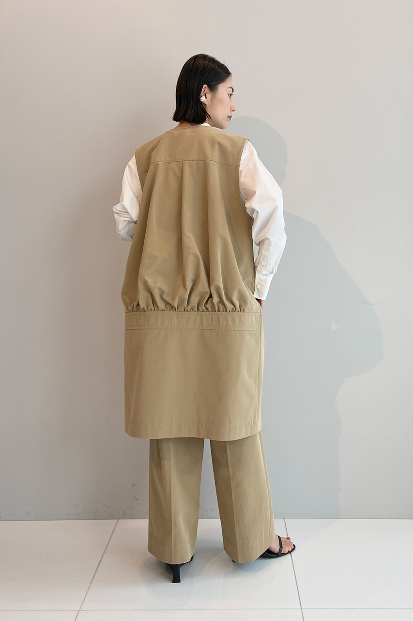 ジレはすっきりとしたフロントと、ボリュームフォルムのバックスタイルのコントラストが魅力。横から見たときの立体的な美しいシルエットもポイントです。