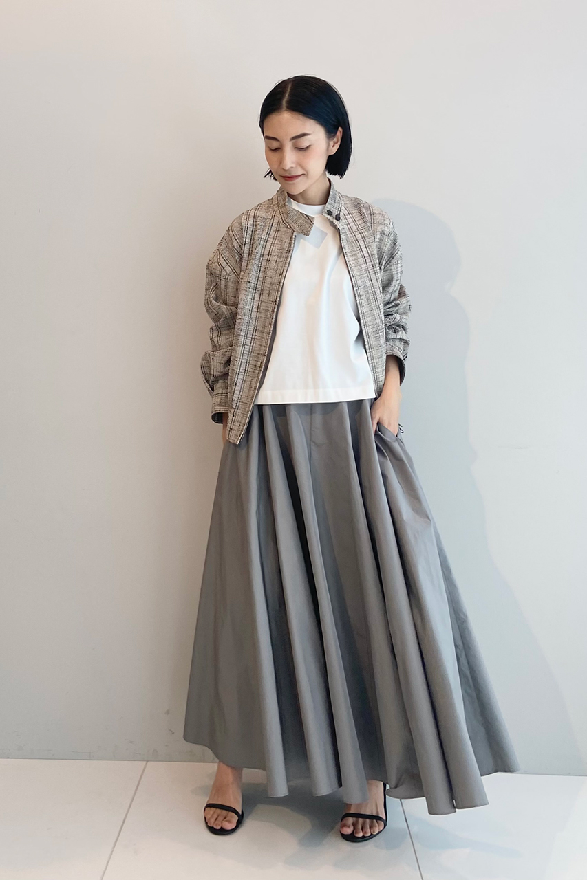 メンズのムードを感じるツィードのスタンドカラーブルゾンに、上品な光沢感のタフタスカートを合わせ、素材のテンションをつけた着こなしに。