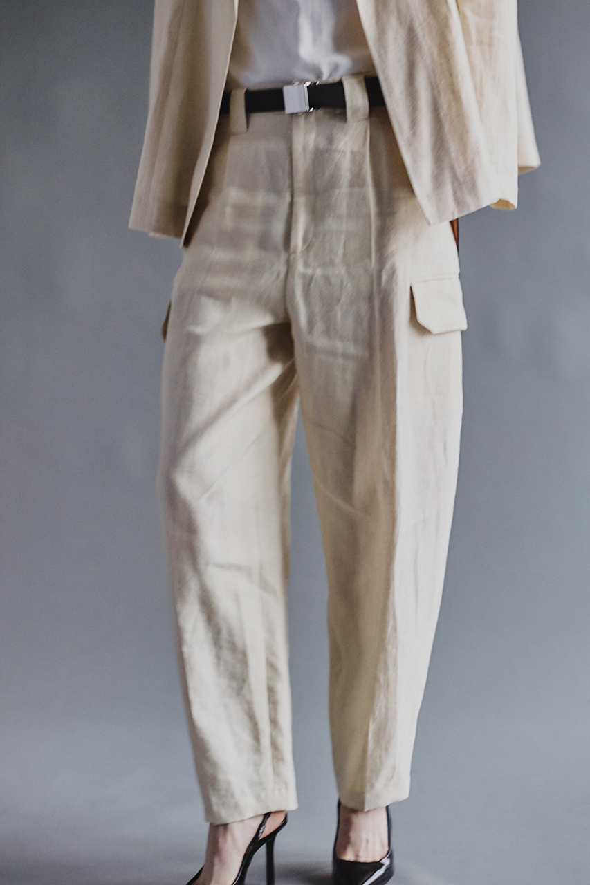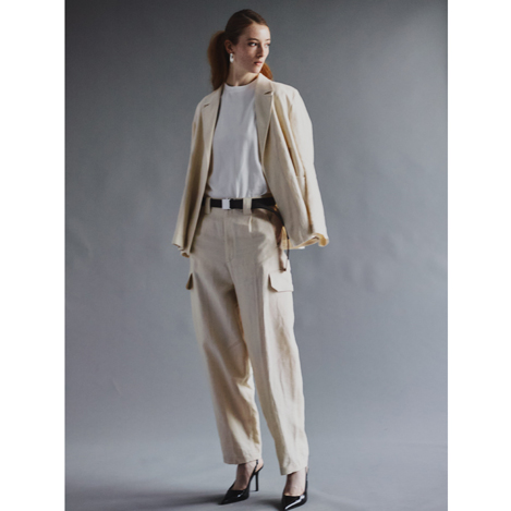「オブリオ」でお馴染みのイタリアの老舗メーカー、リッチェーリ社のリネン素材を使い、ドライな風合いとリラックスしたムードでこれからの時期にぴったりです。ジャケットは、クラシックなテーラードにフェミニンなフレアシルエットを融合させたデザイン、共素材のベルトでフォルムの変化楽しんでいただけます。パンツはサイドの大きなフラップディテールがスポーティな雰囲気にしあげています。
