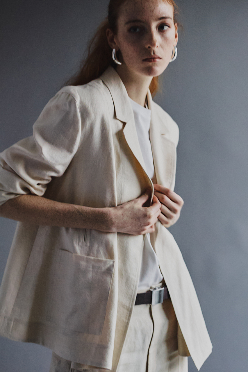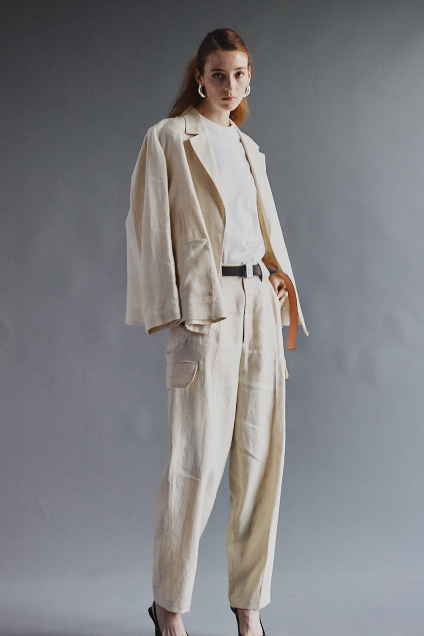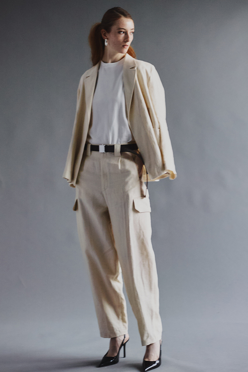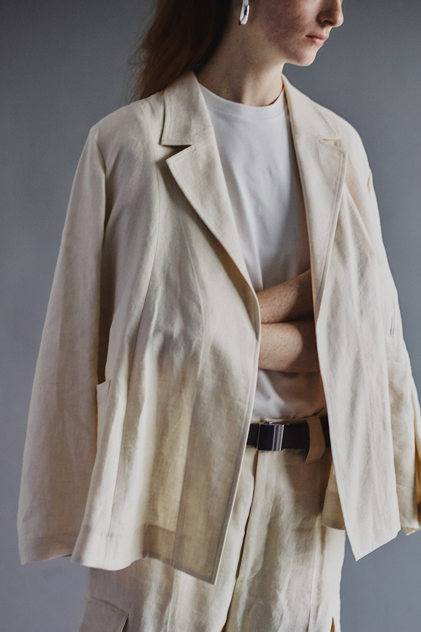 リネンシルク素材を使った、リラックスフィットのジャケットとバレルシルエットパンツのセットアップ。
