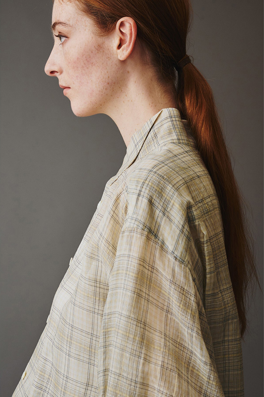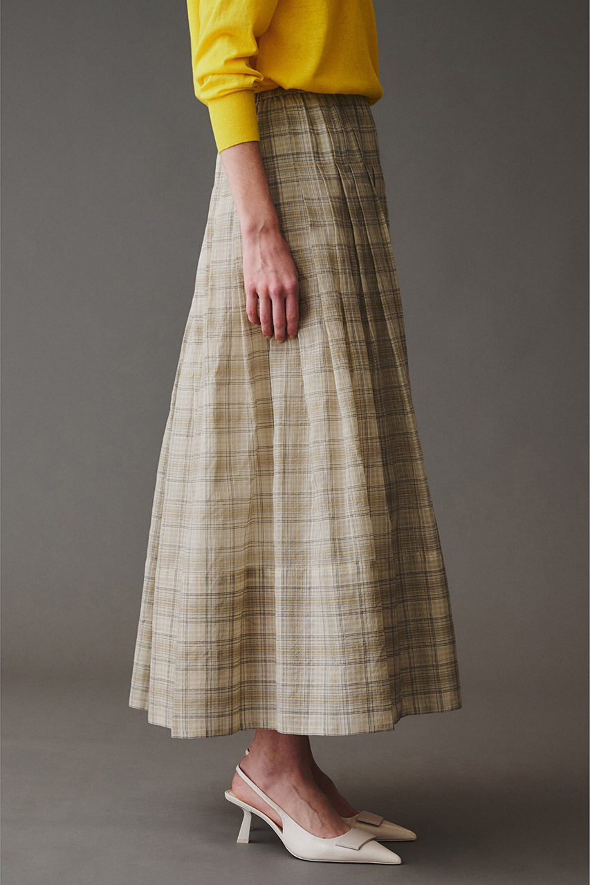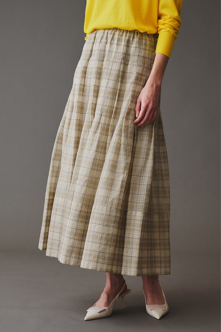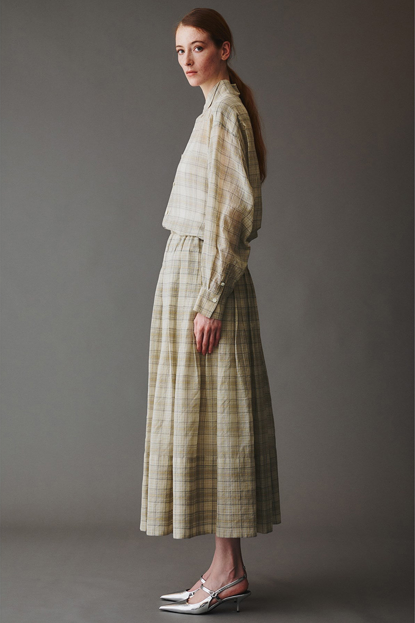 シアーチェックシャツとミディスカートのセットアップは、イタリアの老舗テキスタイルメーカーFaliero Sarti(ファリエロサルティ)社のコットンシルク素材を使い、柔らかで優しい印象が叶います。シャツはゆったりとしたアームホールやオーバーサイズシルエット、スカートは繊細なタックでつくる軽く柔らかなフレアシルエットデザインで、リラックス感を演出して。