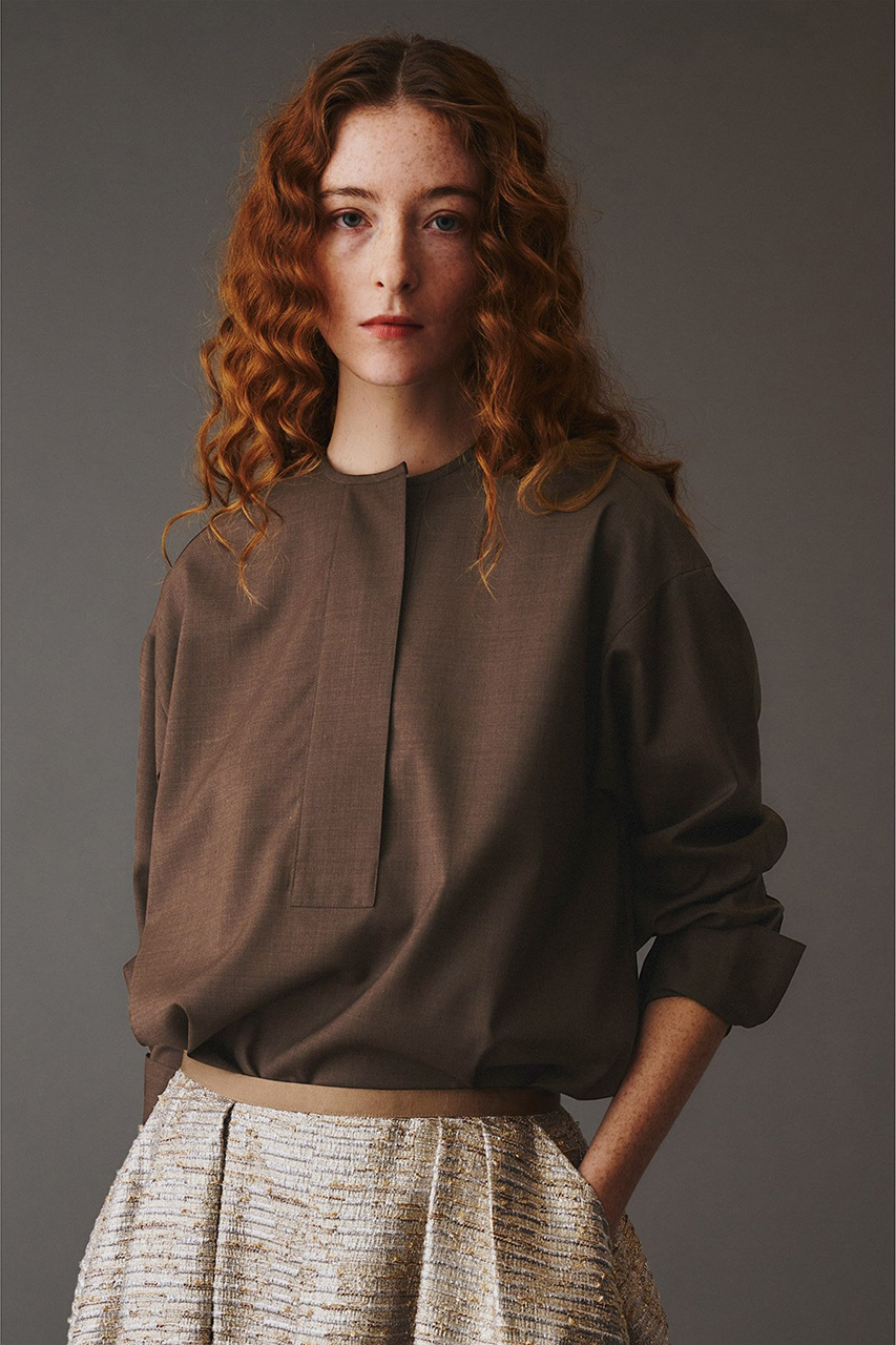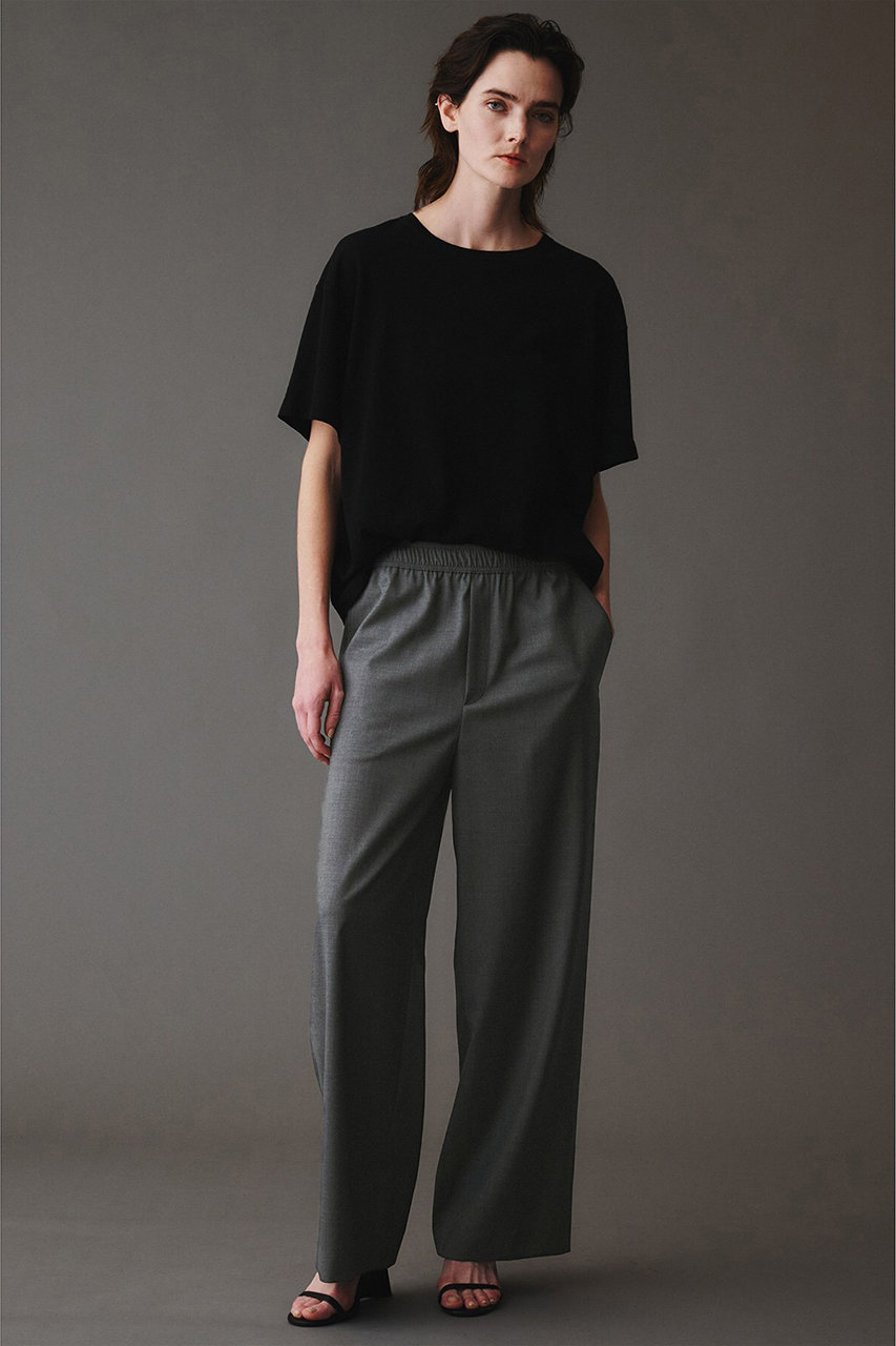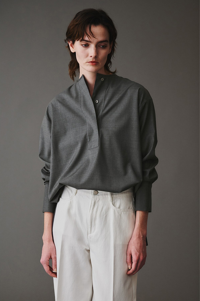コンパクトな質感のウーステッドで仕立てたプルオーバーシャツとリラックス感あふれるワイドレッグパンツのセットアップ。