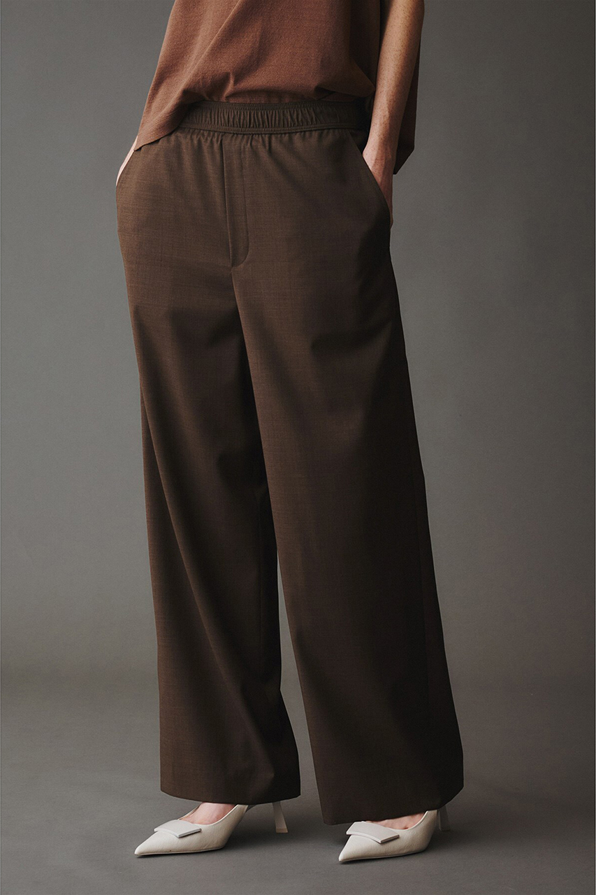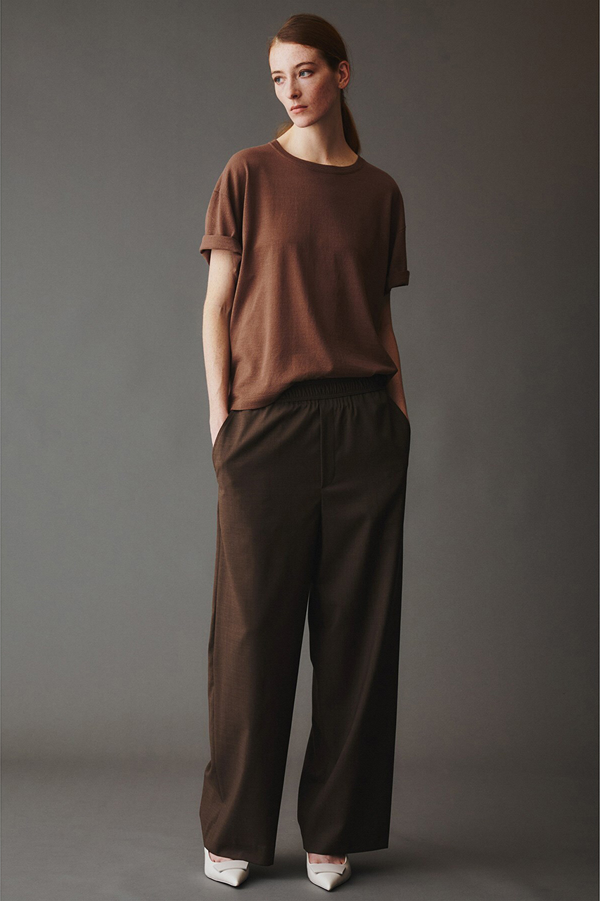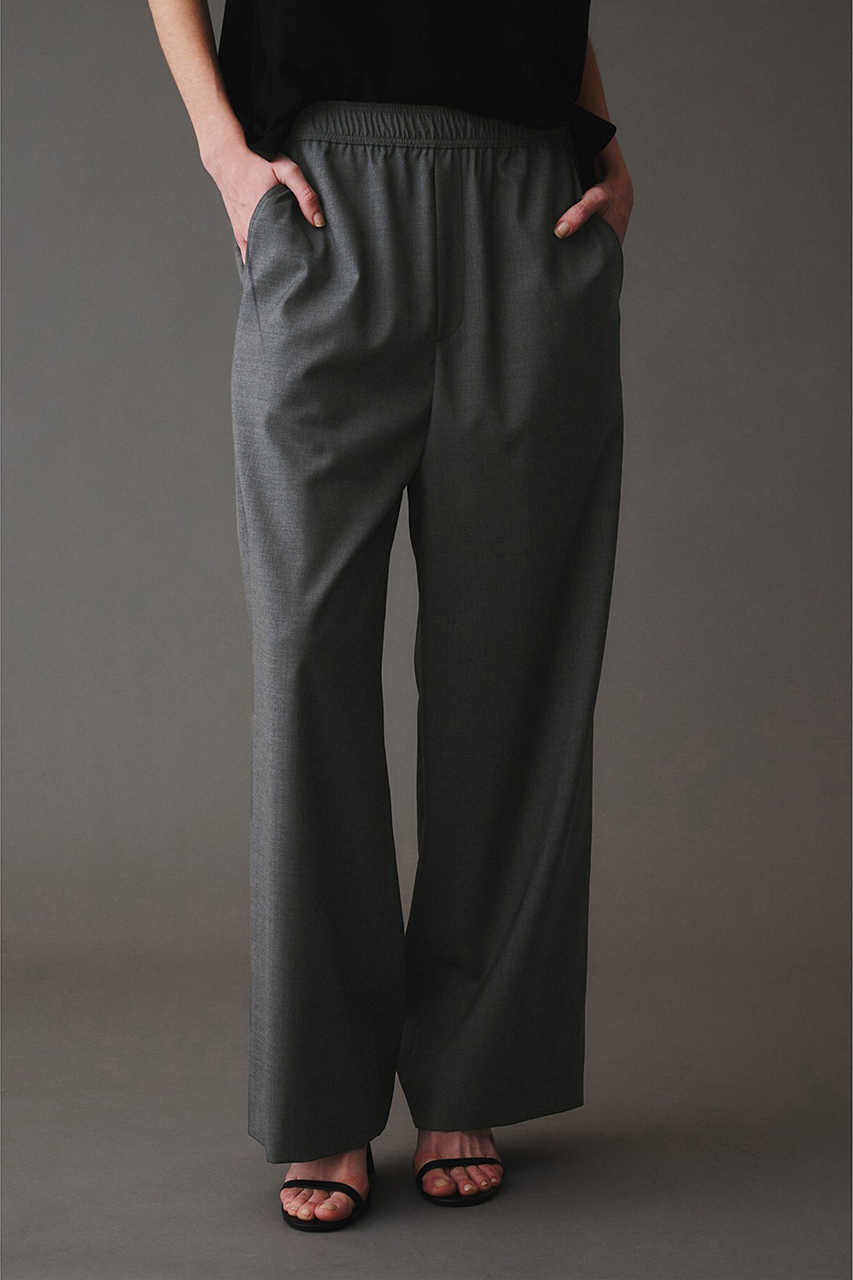 コンパクトな質感のウーステッドで仕立てたプルオーバーシャツとリラックス感あふれるワイドレッグパンツのセットアップ。