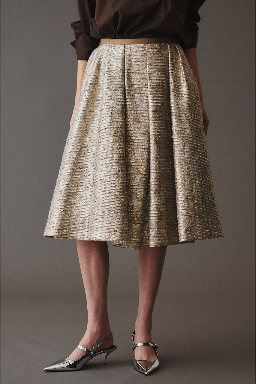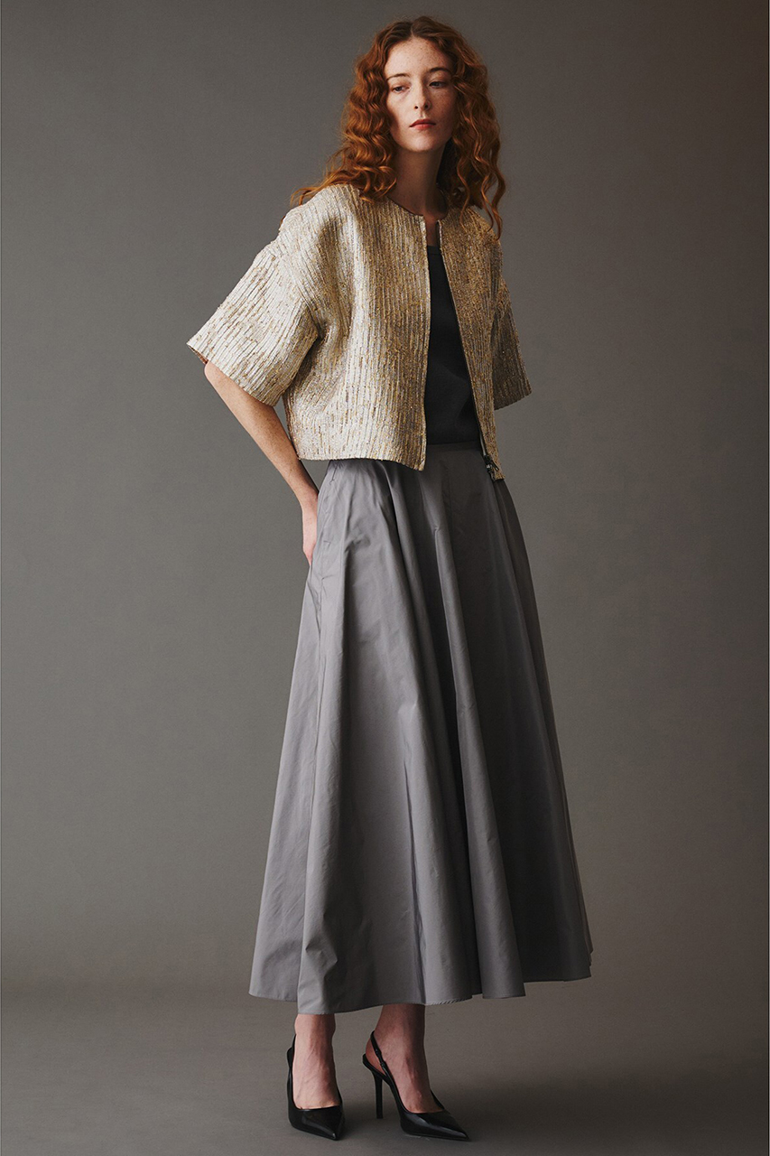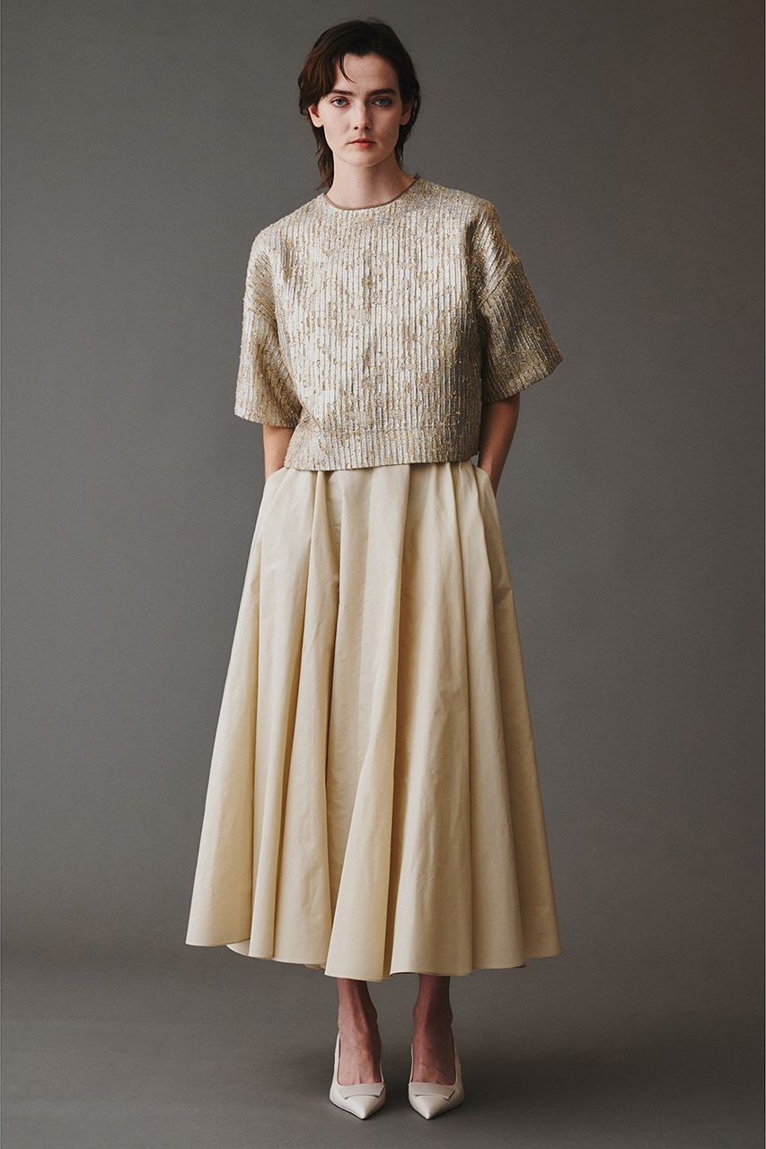 スカ-トは、不規則に畳んだタックとシャイニーな輝きがソフトなボリューム感のあるシルエットに個性を添えて。