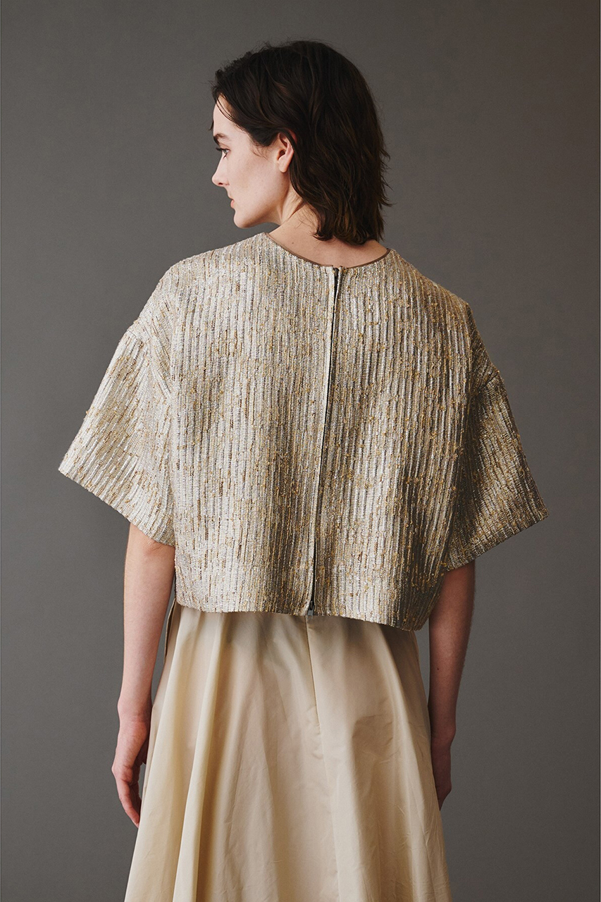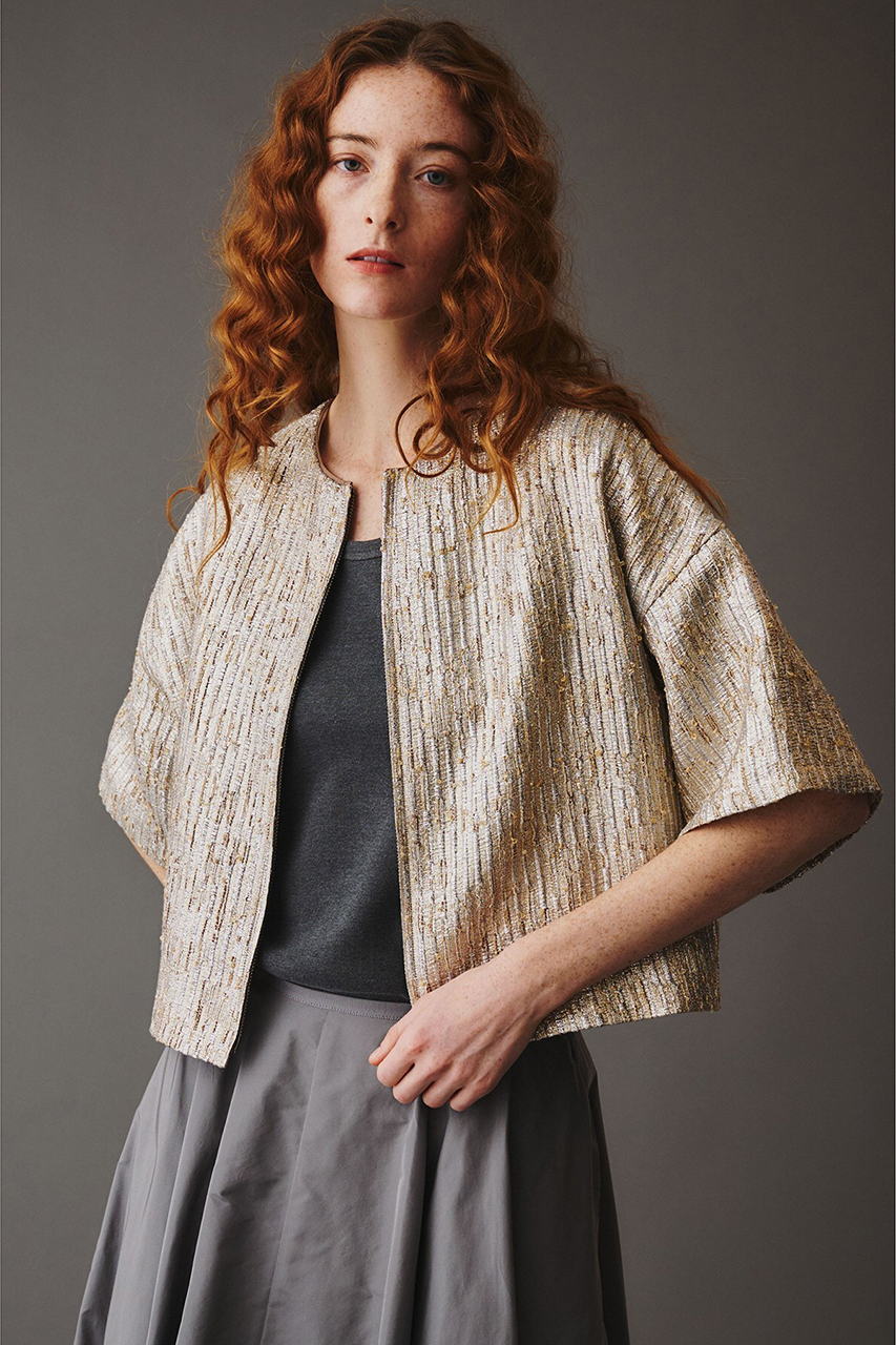 ラメジャカードのクロップドジュエルトップとタックスカ-トのセットアップは、エッジの効いた素材感が華やか。