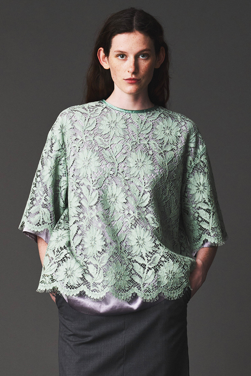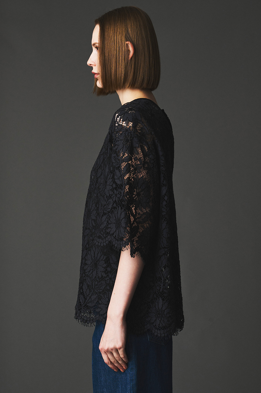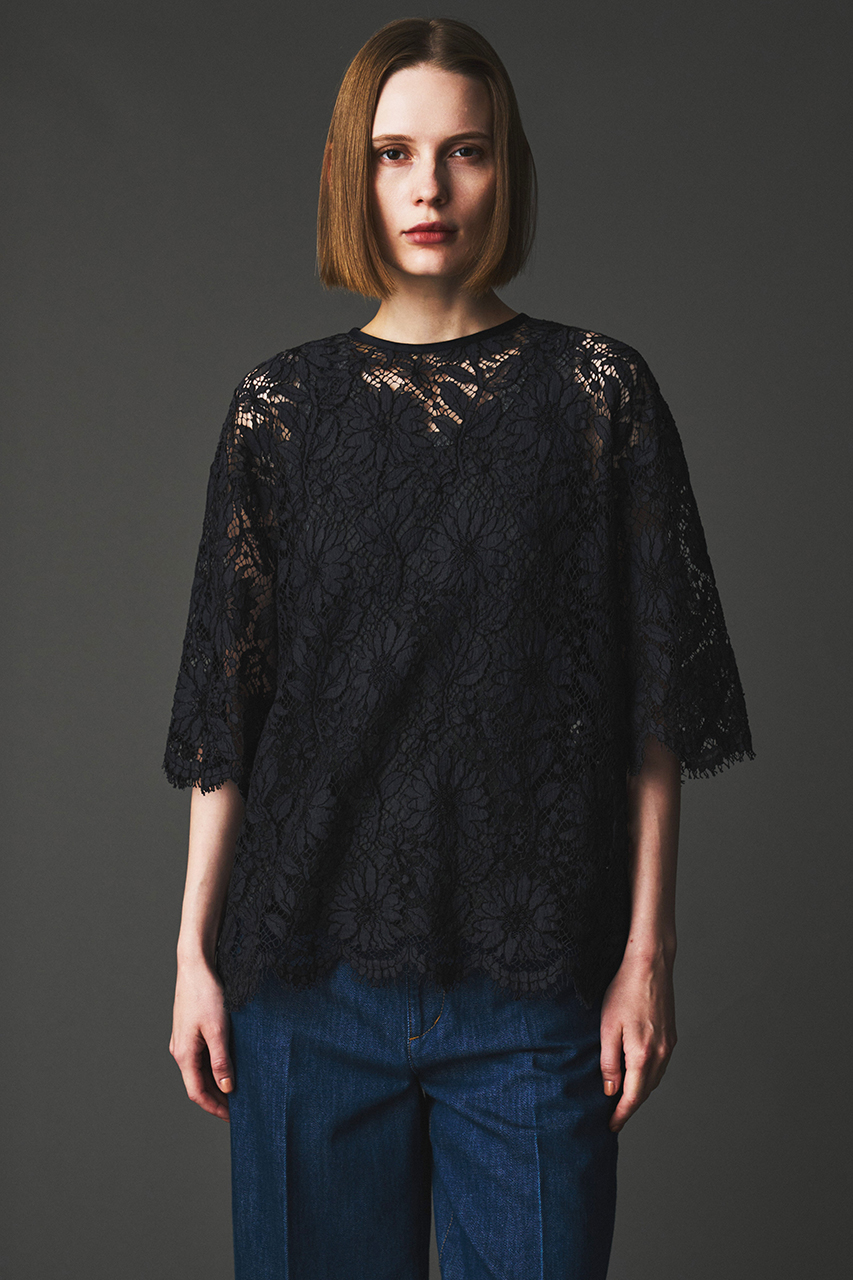 Tブラウスはあえてリラックスしたシルエットにすることで生まれるラグジュアリーとラフさのバランスが 新鮮。 レース単体でレイヤリングも出来る取り外し可能なサテンライナー付きで、着こなしの幅が広がります。デニムと合わせてデイリーな着こなしにも。