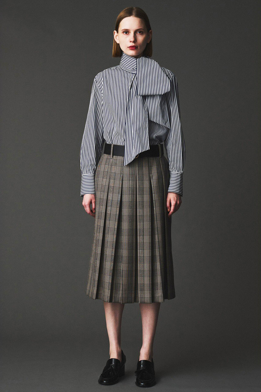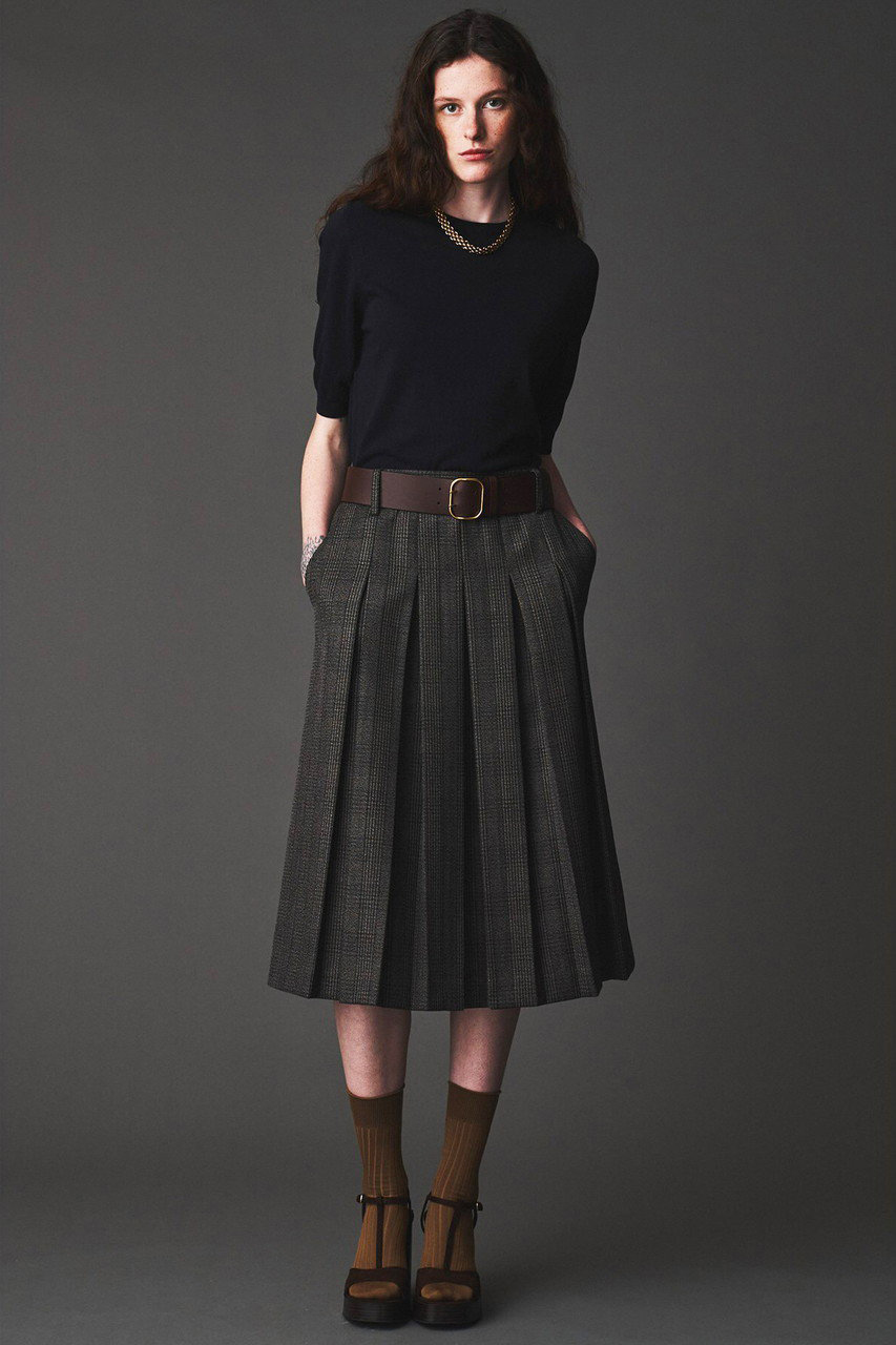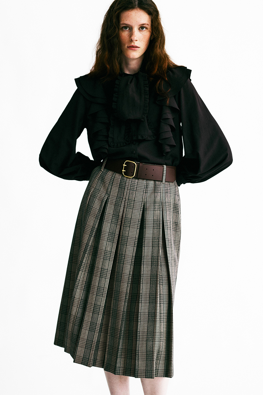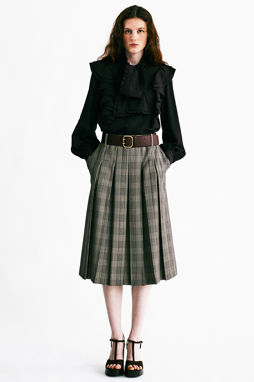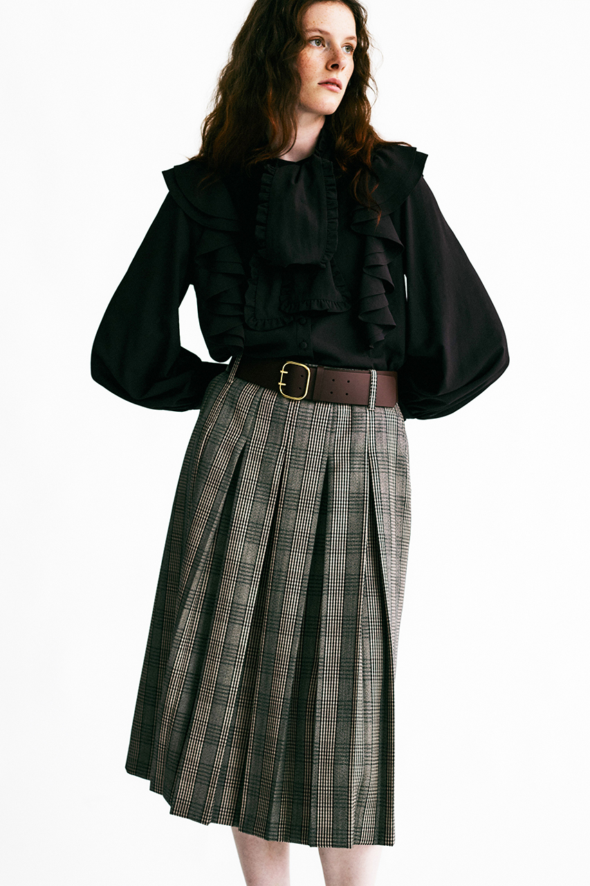 ボックスプリーツを前面に配したチェックスカートと太ベルトでウエストマークした着こなしはレトロシックな雰囲気。