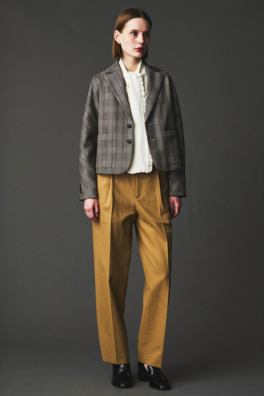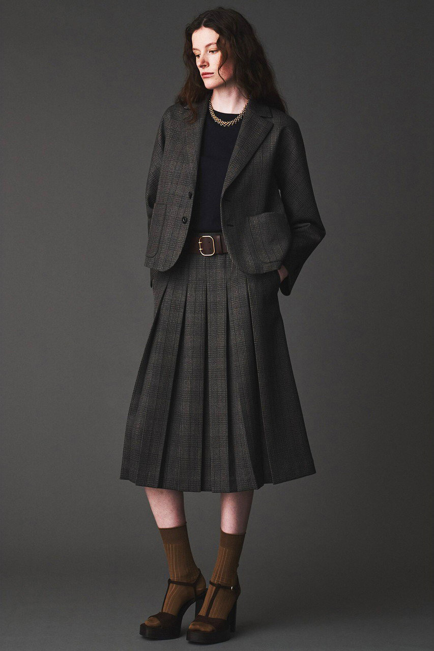 メランジヤーン使いのチェックが印象的なボックスシルエットのシングルブレスト・ジャケットとボックスプリーツスカートのセットアップ。