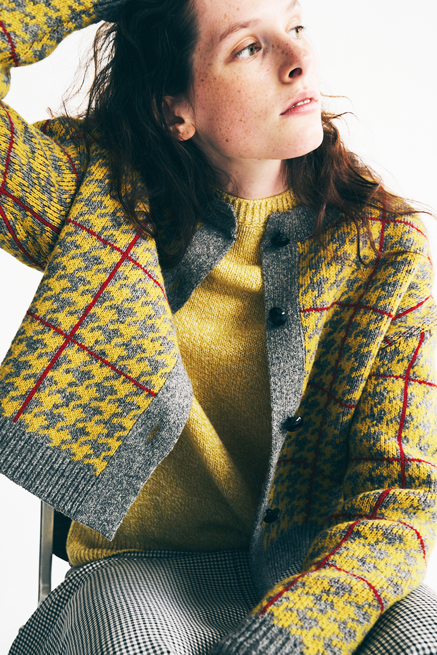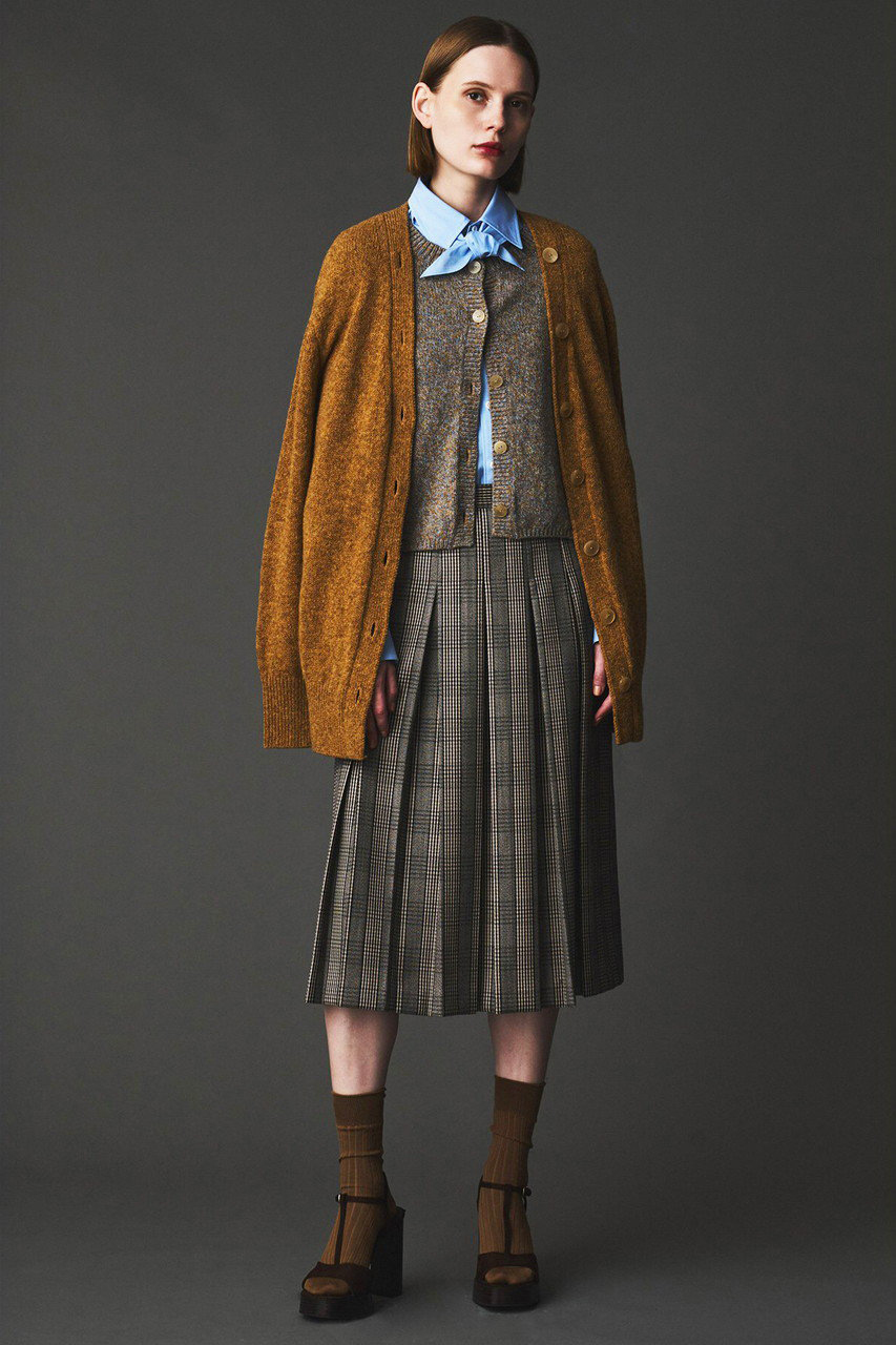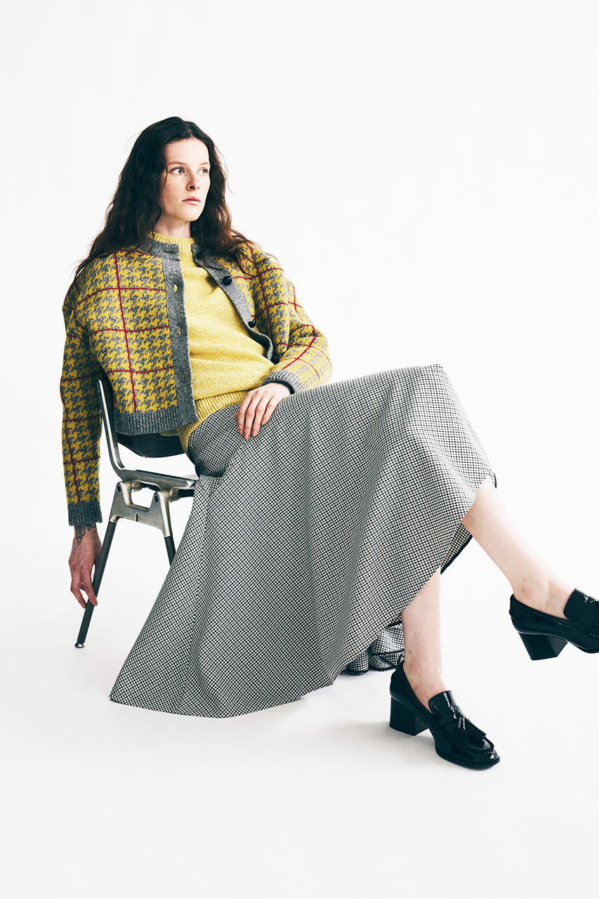 マルチカラーのチェックカーディガンにマーメイドシルエットが印象的なチェックスカートと合わせた遊び心のある着こなしも新鮮です。