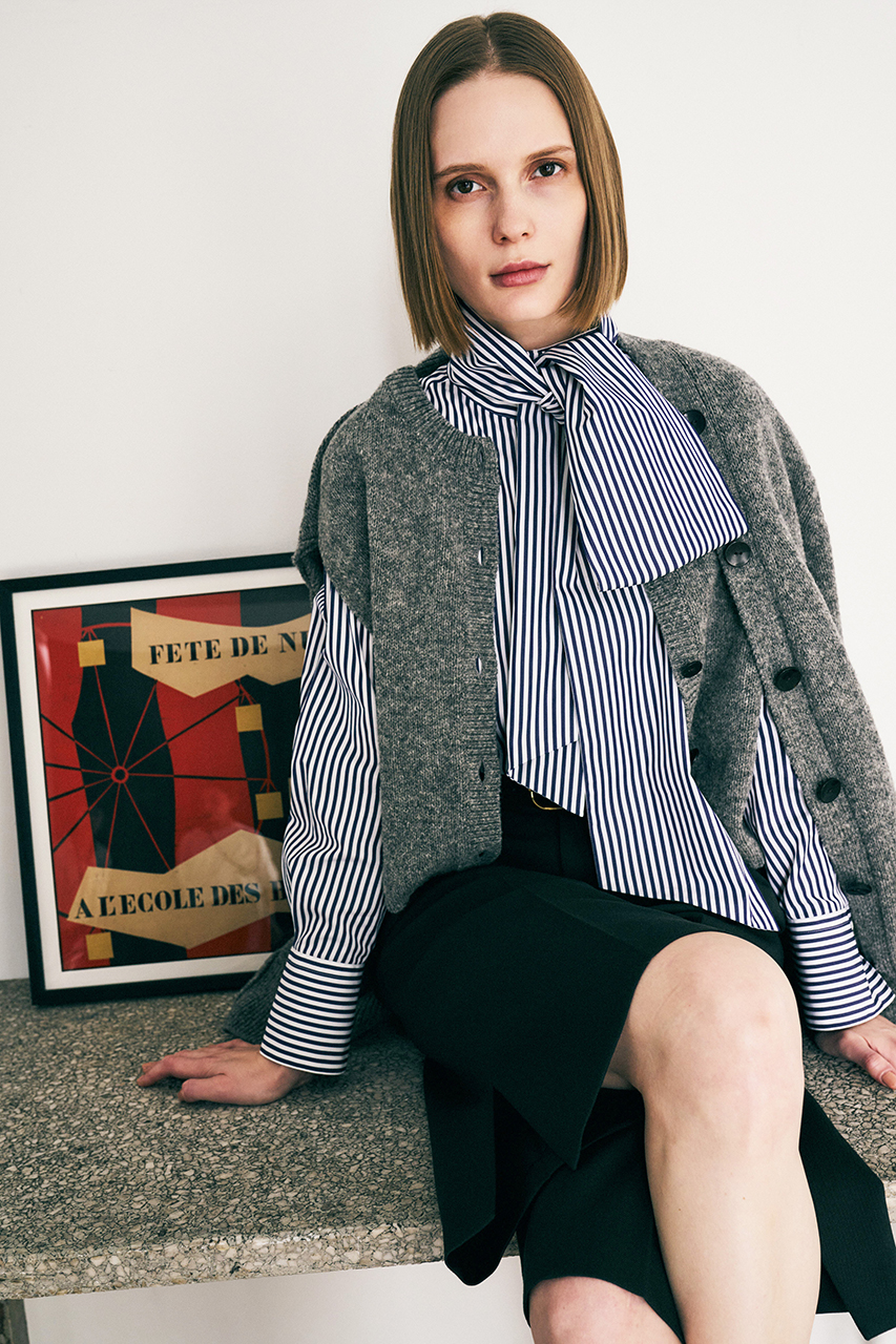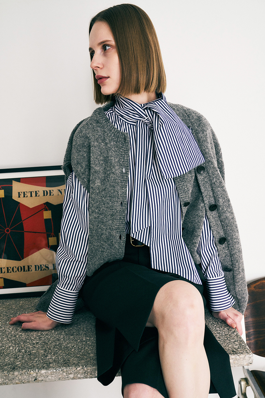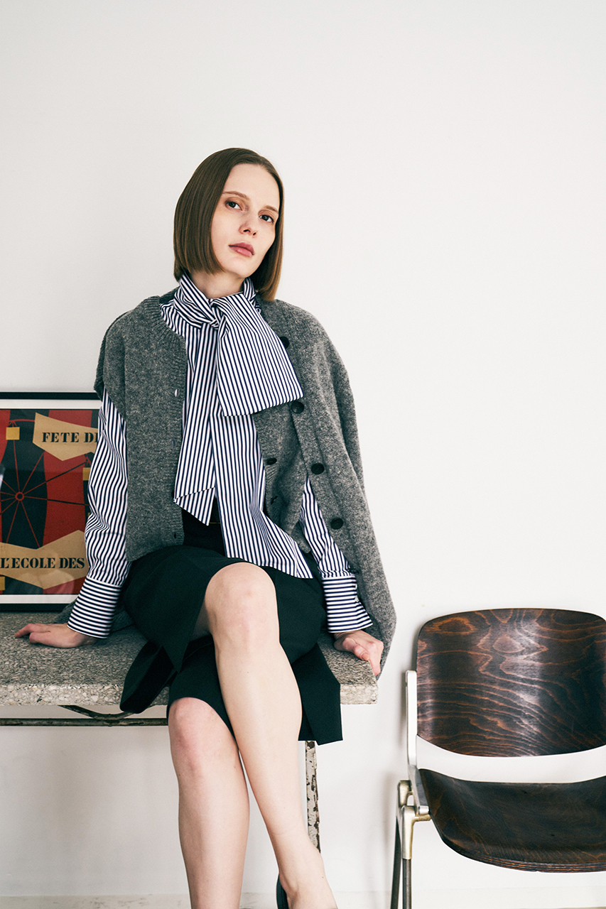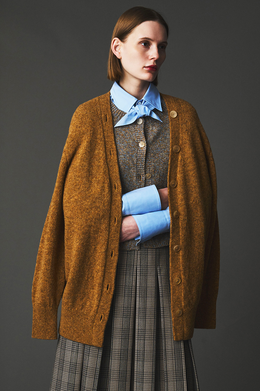 前身頃だけ重ね着をしたようなギミックのあるフェイク・レイヤードデザインが面白いカーディガン。カーディガン部分を肩掛けして今年トレンドのボウタイシャツを効かせたり、レイヤードを楽しめる一枚です。洗練されたリラックス感が漂う、暖かさと奥行きのあるメランジカラーも魅力。