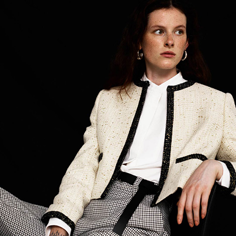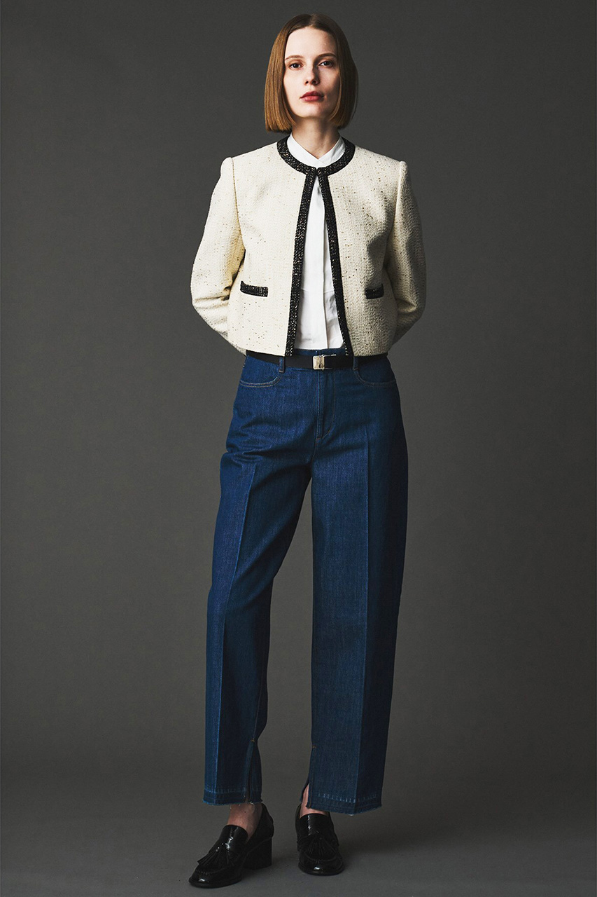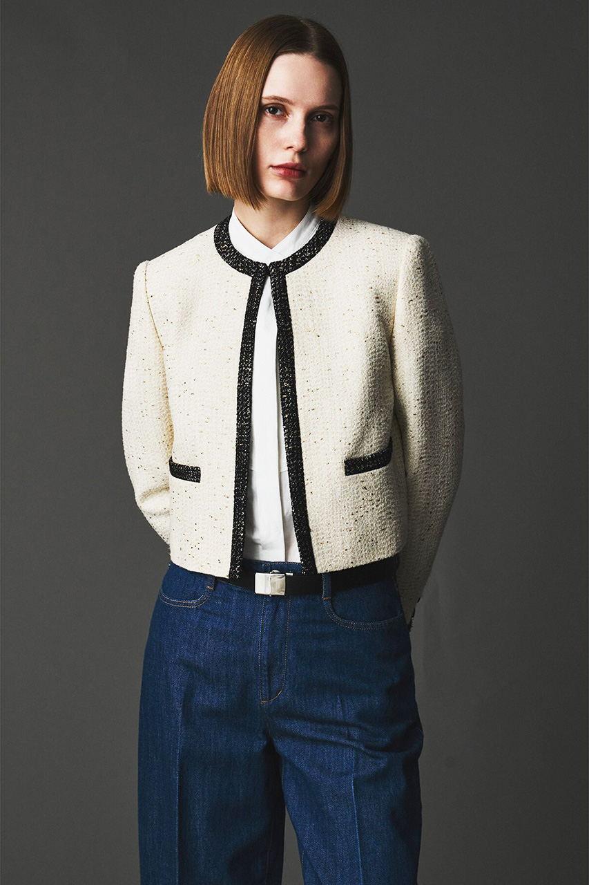 クラシカルで上品なツイードを表現したラメジャカード仕立てのノーカラージャケット。