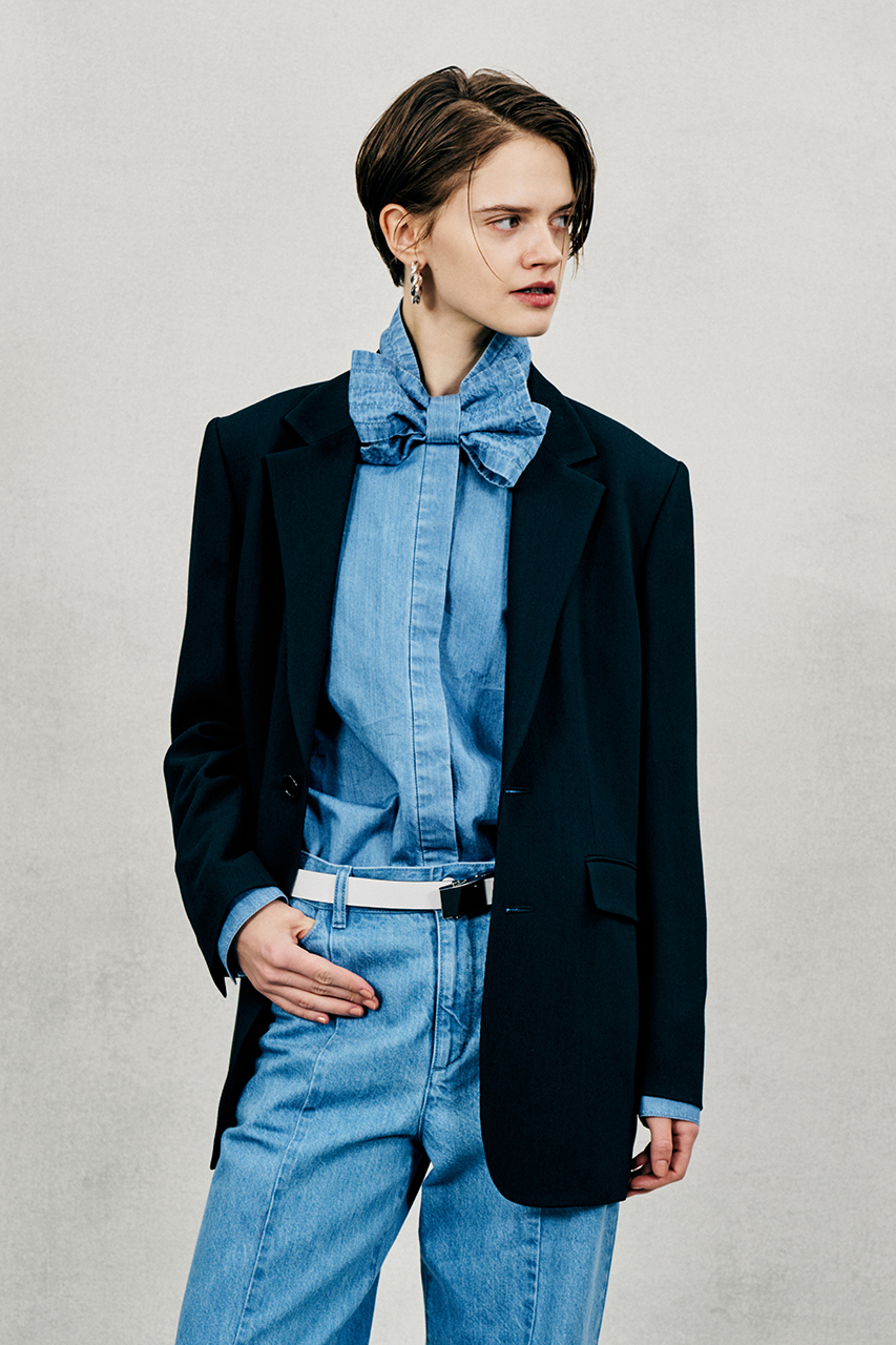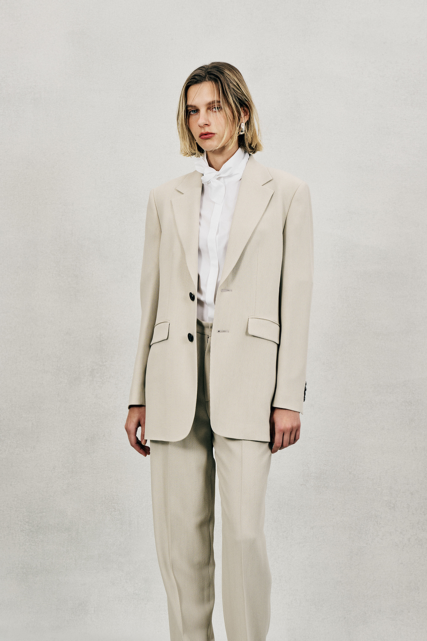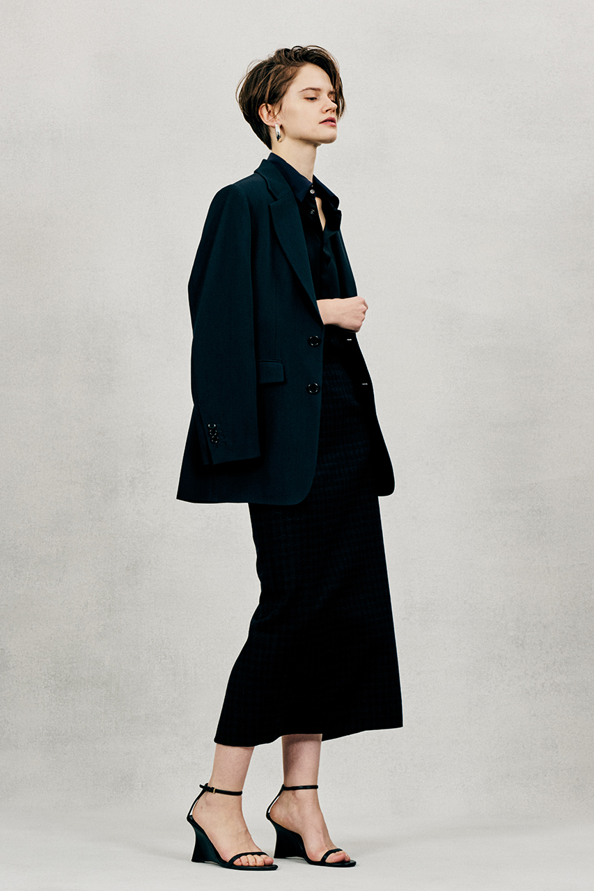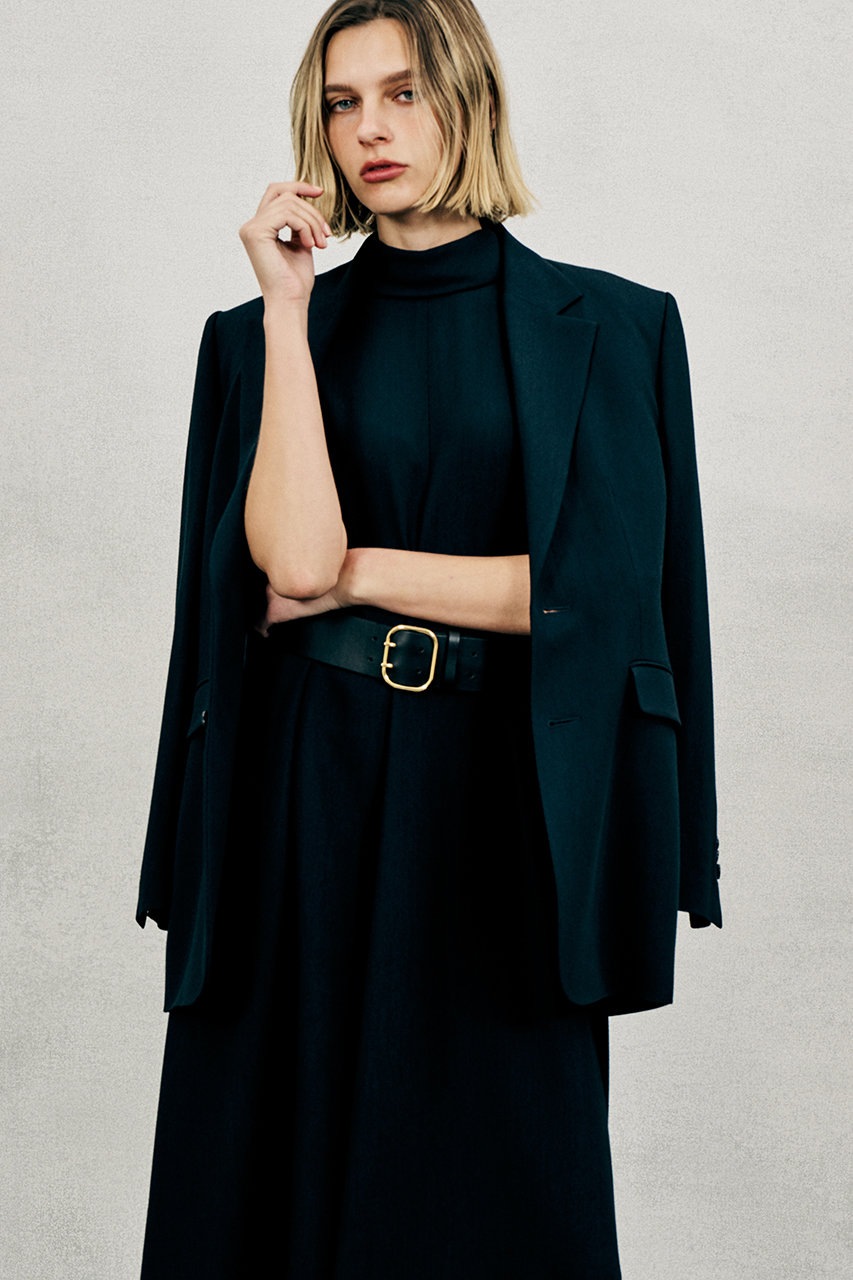 同素材のテーパードパンツと合わせたハンサムなセットアップスタイル、ミニマムな印象のフロアレングス・ドレスと組み合わせるとぐっとエレガントにも着こなせる一着です。