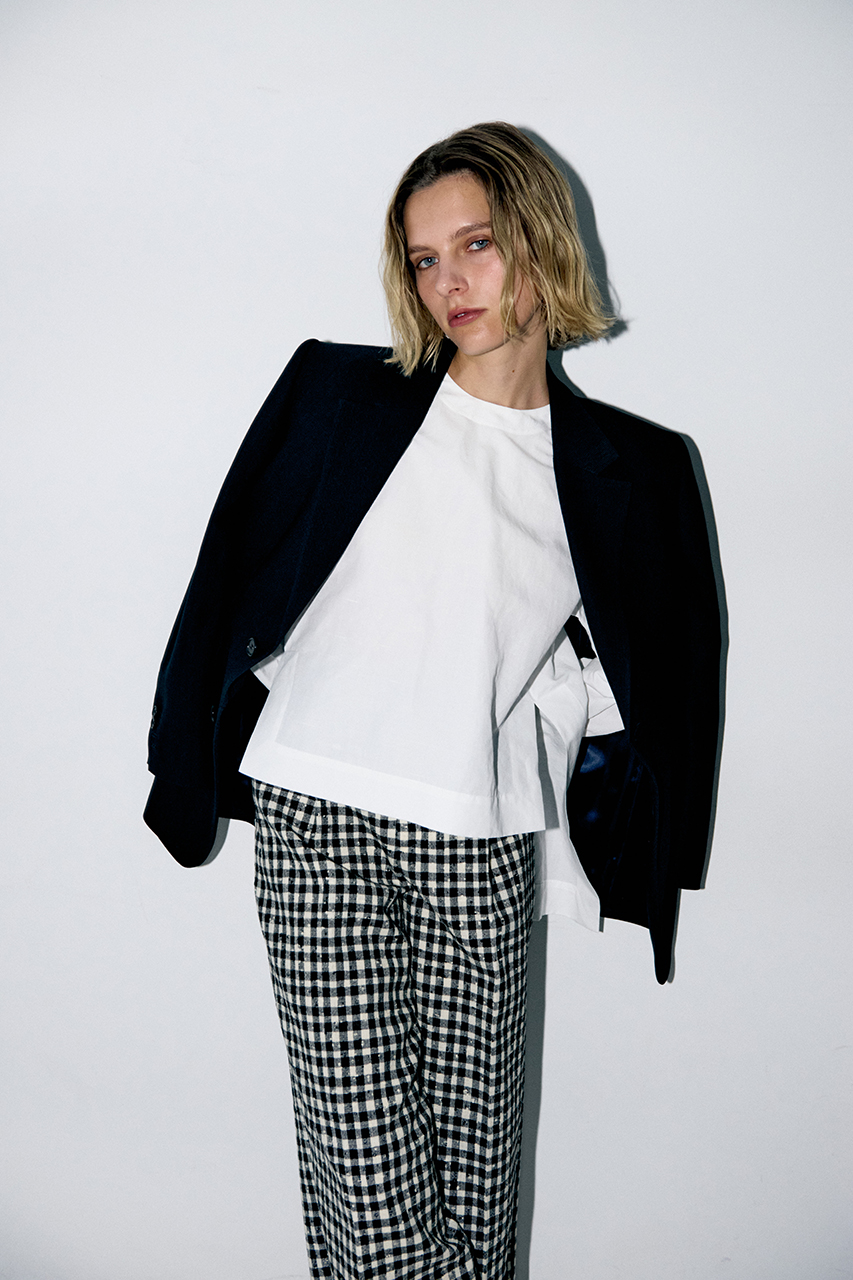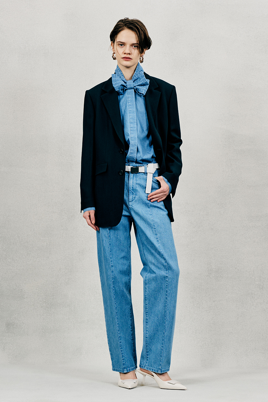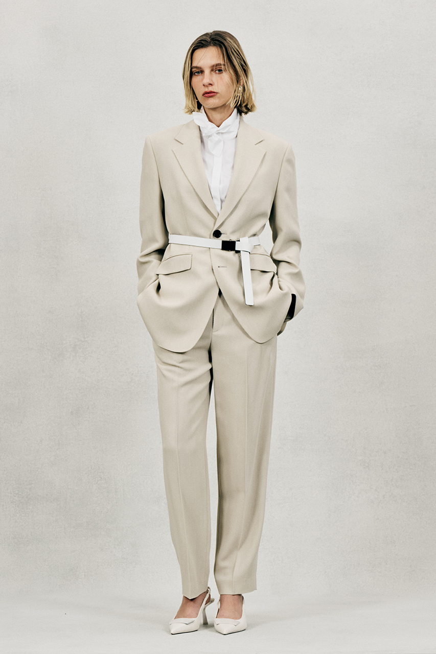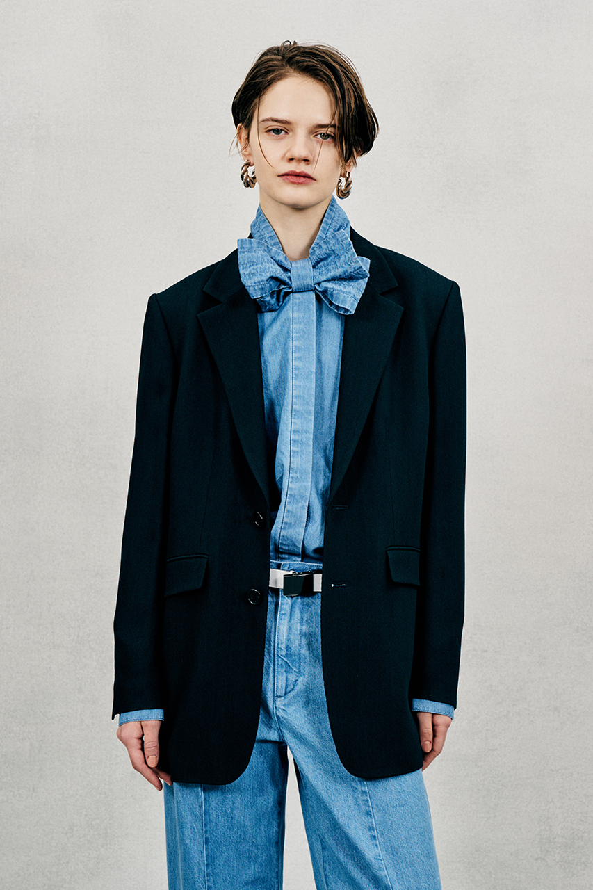 同素材のテーパードパンツと合わせたハンサムなセットアップスタイル、ミニマムな印象のフロアレングス・ドレスと組み合わせるとぐっとエレガントにも着こなせる一着です。