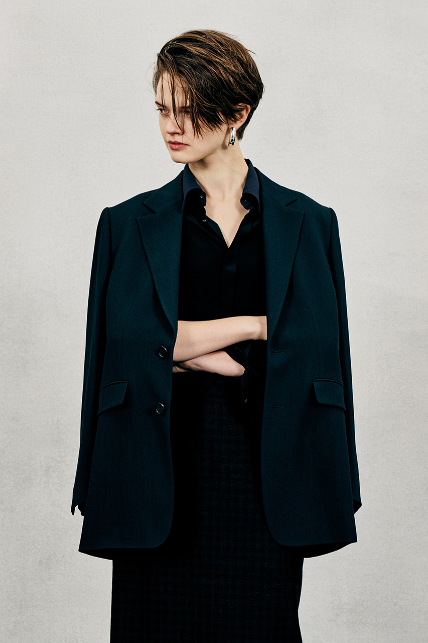 シングルブレストのトリコチンジャケットは、ノッチドラペルと、緩やかに体のラインを描くクラシコスタイルが魅力。