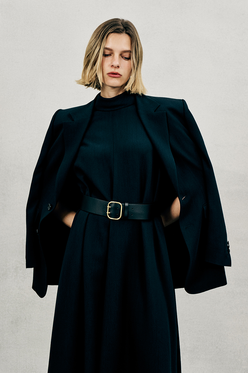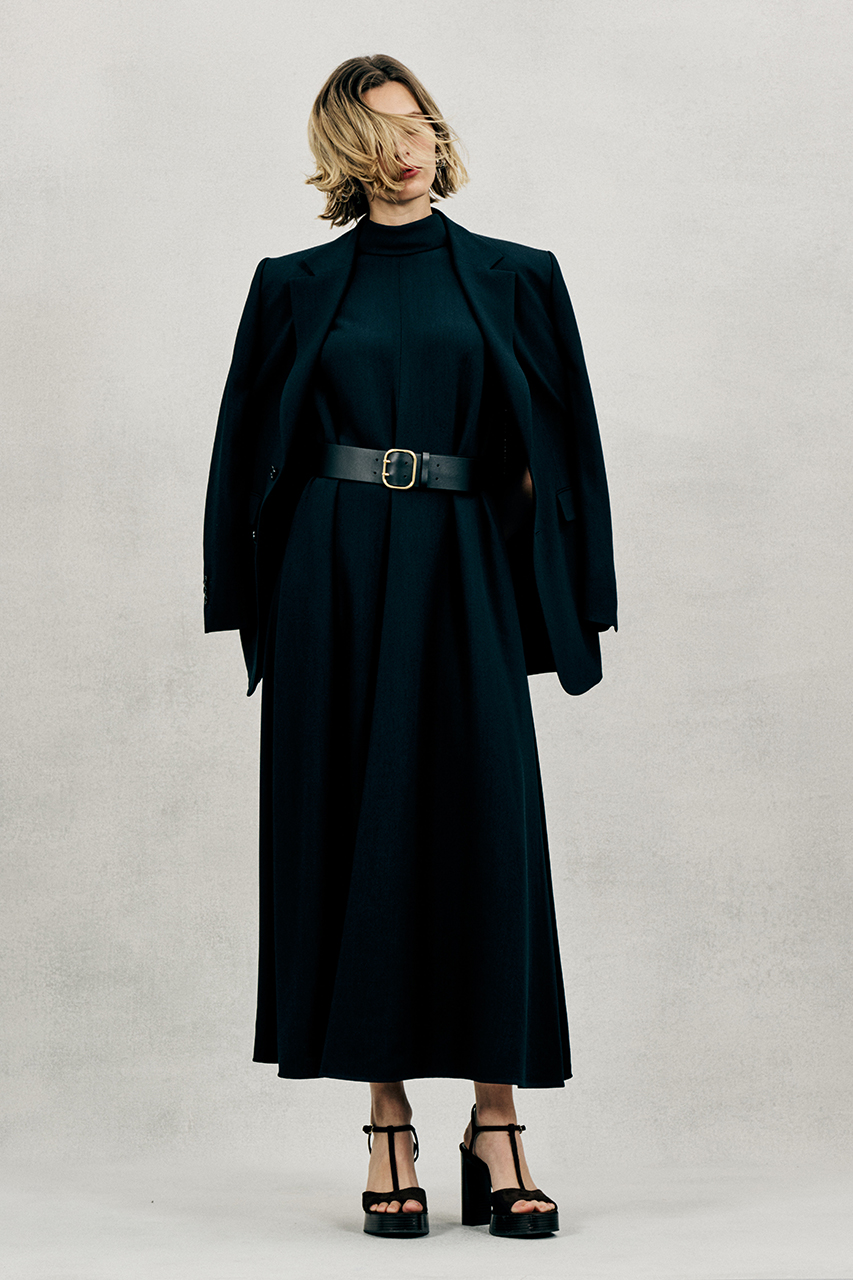 構築的なフォルムに綾目の立ったドライかつとろみのある素材のバランスが控えめながらも洗練された印象を際立たせて。