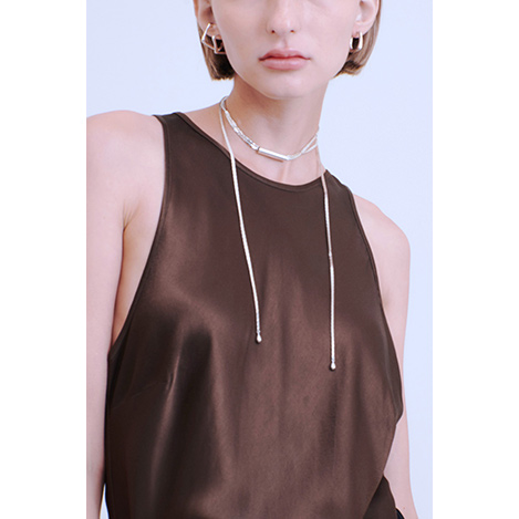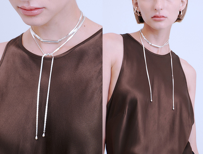 シルバーの上品な輝きが目を引く一本は、スライド式チェーンで長さ調整が可能。ロングネックレスとしてコーディネートの主役にしたり、短くしてチョーカー風に、さらにはタイのようにアクセント使いも。