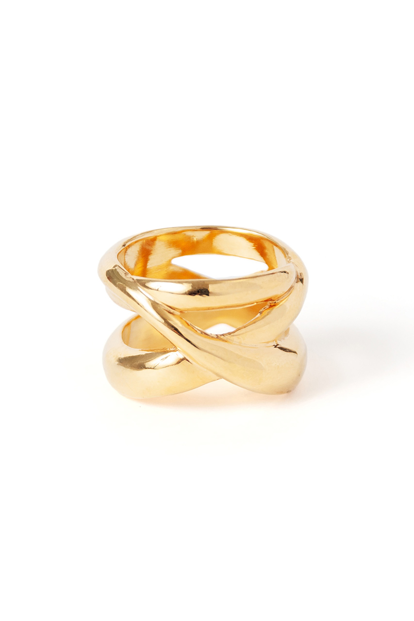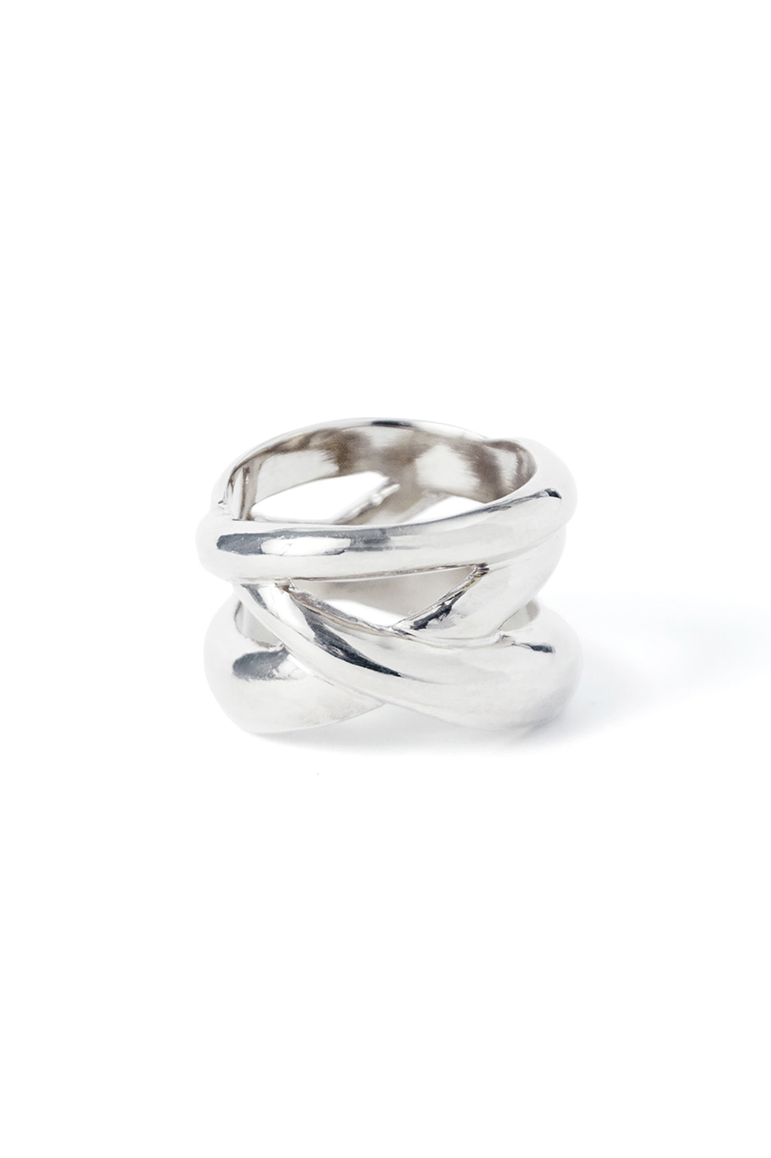 三つ編みのように絡み合う立体的なフォルムと、指元を包み込むワイドな幅が印象的。ひとつ添えるだけで手元に視線を集め、コーディネートの主役に。