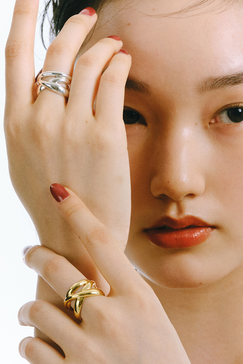 カラーはシルバーとゴールドの2色展開。単体使いでも、重ねづけでも、着こなしを美しく引き締めてくれる、大人のための万能リングです。