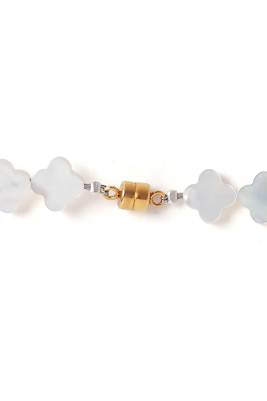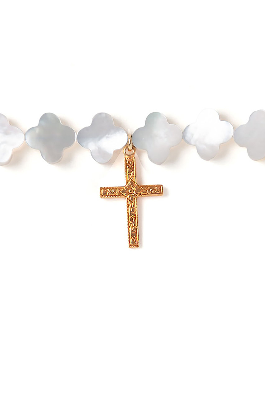 お花の形にカットされたシェルが、涼やかな透明感とさりげない可愛らしさをプラス。クロスやコインモチーフのペンダントと組み合わさることで、手元に華やかなストーリーを添えてくれます。