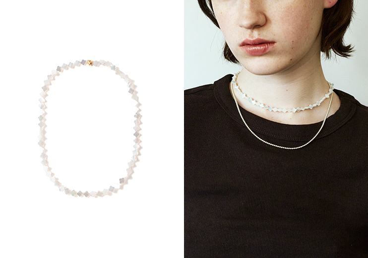 涼しげな印象が漂う天然シェルを基調としたネックレス。光があたる角度によって、柔らかく虹色に輝くシェルはスタイリング全体をエレガントな印象にみせてくれます。ネックレスとしてはもちろん、二重にしてブレスレットとしてもお使いいただける優秀アイテム。夏のスタイリングのアクセントとしてぜひお楽しみください。