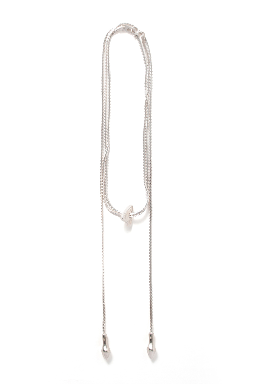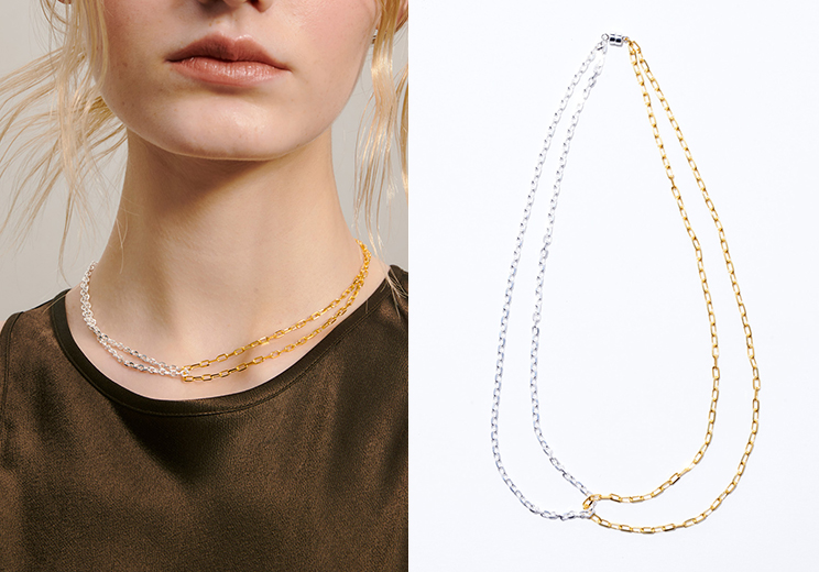 チェーンが2本交差するようにデザインされた特徴的なネックレス。大人の魅力あふれるエレガントさを持ったシルバーチェーンと、存在感ある輝きで華やかさのあるゴールドチェーンの絶妙な組み合わせが涼感を与え、コーディネートの魅力をさらに引き出してくれます。シンプルなデザインのため、日常使いしやすくカジュアルにもオケージョンにもさまざまなシーンでお使いいただけます。