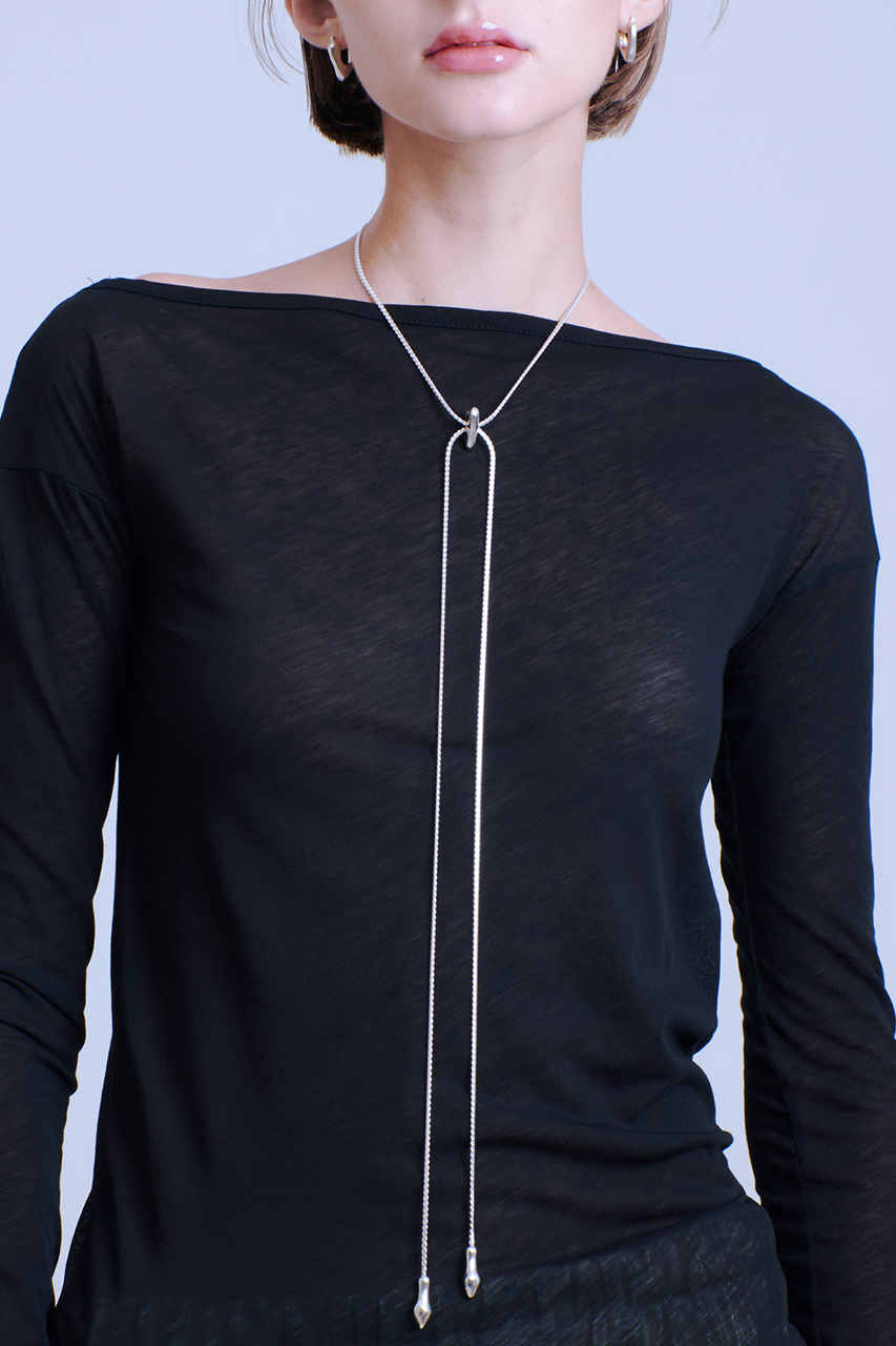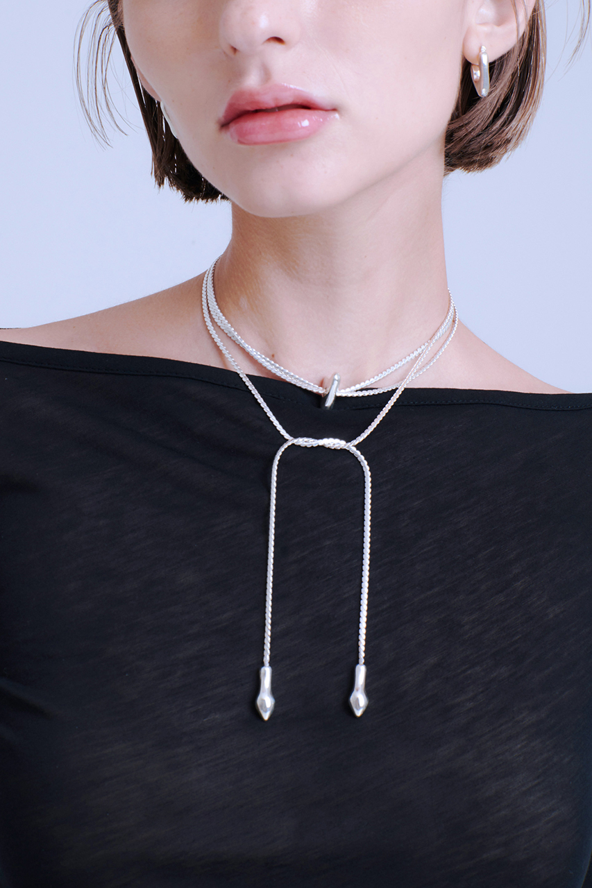 さりげないハートのチャームで繋がった長さ120センチのロングネックレス。スネークチェーンを採用した、モードな雰囲気漂う個性を引き出すアイテムです。自由に巻き方を変えて楽しむことができ、ひとつ取り入れるだけでもコーディネートの幅が広がるワンランク上のシルバーアイテム。夏のシンプルなスタイリングにもよく映えるマストジュエリーです。