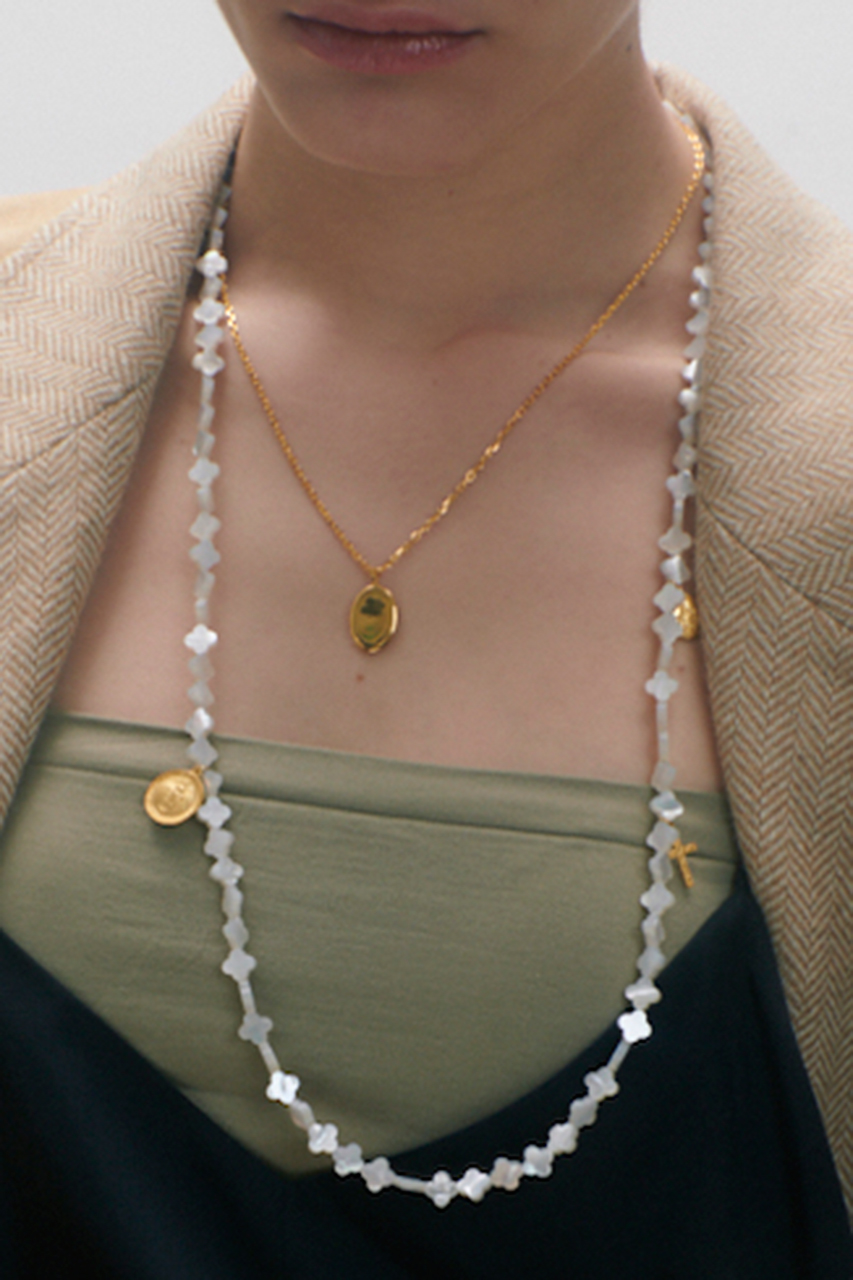 楕円形のコインチャームは、装飾を削ぎ落としたミニマルさがポイント。上質な冬の雰囲気を彩るゴールドの輝きが、日常にも、特別な1日にも寄り添うアイテムです。お手持ちのパール素材やシェル素材のネックレスアイテムとの重ね付けにもおすすめです。