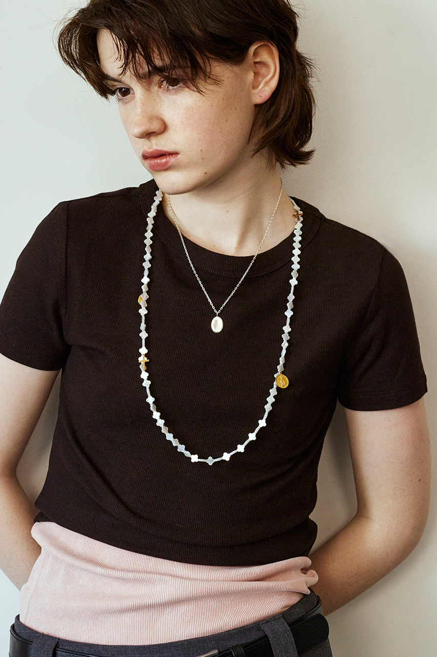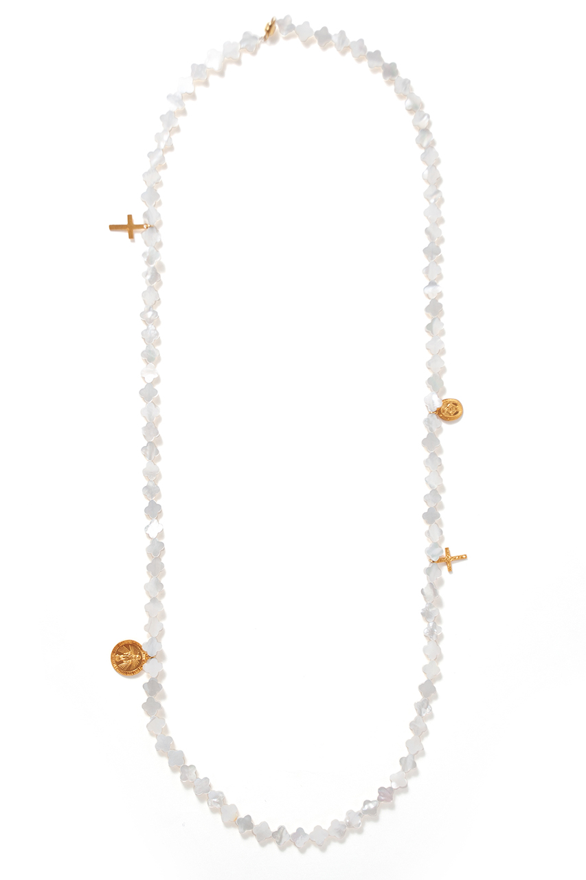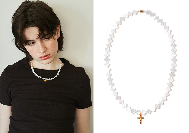 花の形にカットしたシェルにクロスペンダントをあしらったネックレスは、やわらかなニュアンスを首元にもたらす一品。軽やかな白がどんな色のアイテムにも馴染み、静かにその存在を主張してくれるので季節の装いに違和感なく溶け込みます。日常にほんの少しの変化を与えたいときにおすすめです。