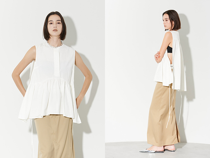 ふんわりとボディを包み込むギャザーデザインが、大人かわいいルックに導くスリーブレスブラウス。コットンリネンの優しいタッチと清涼感でストレスフリーな着用感。