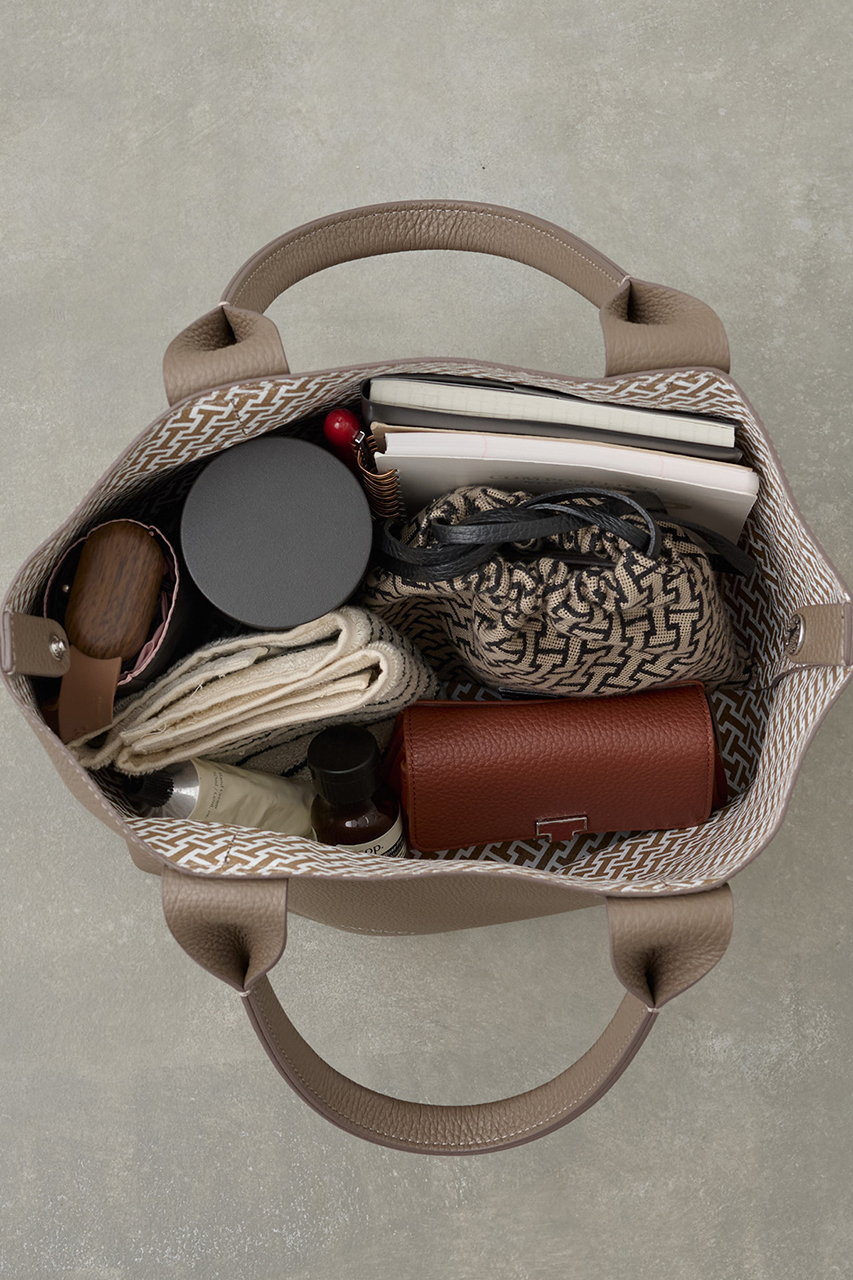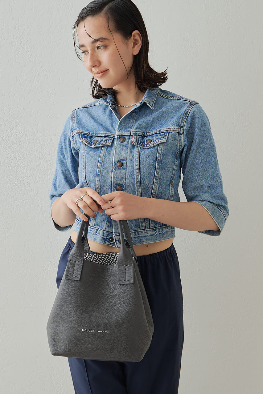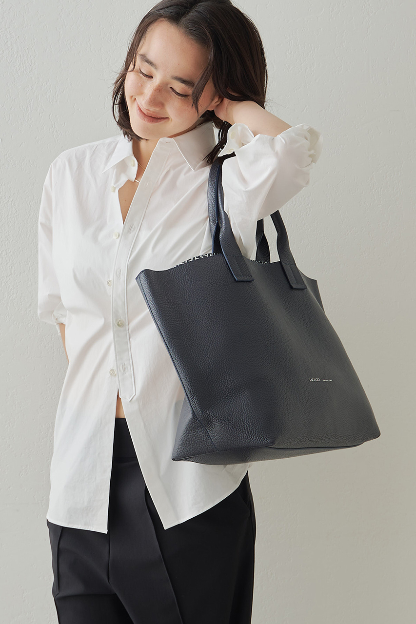 コンパクトでハンドバッグとして腕に収まるサイズ。スタイリングにも馴染みやすくデイリーユースしたいと思わせてくれる、そんなトートバッグです。