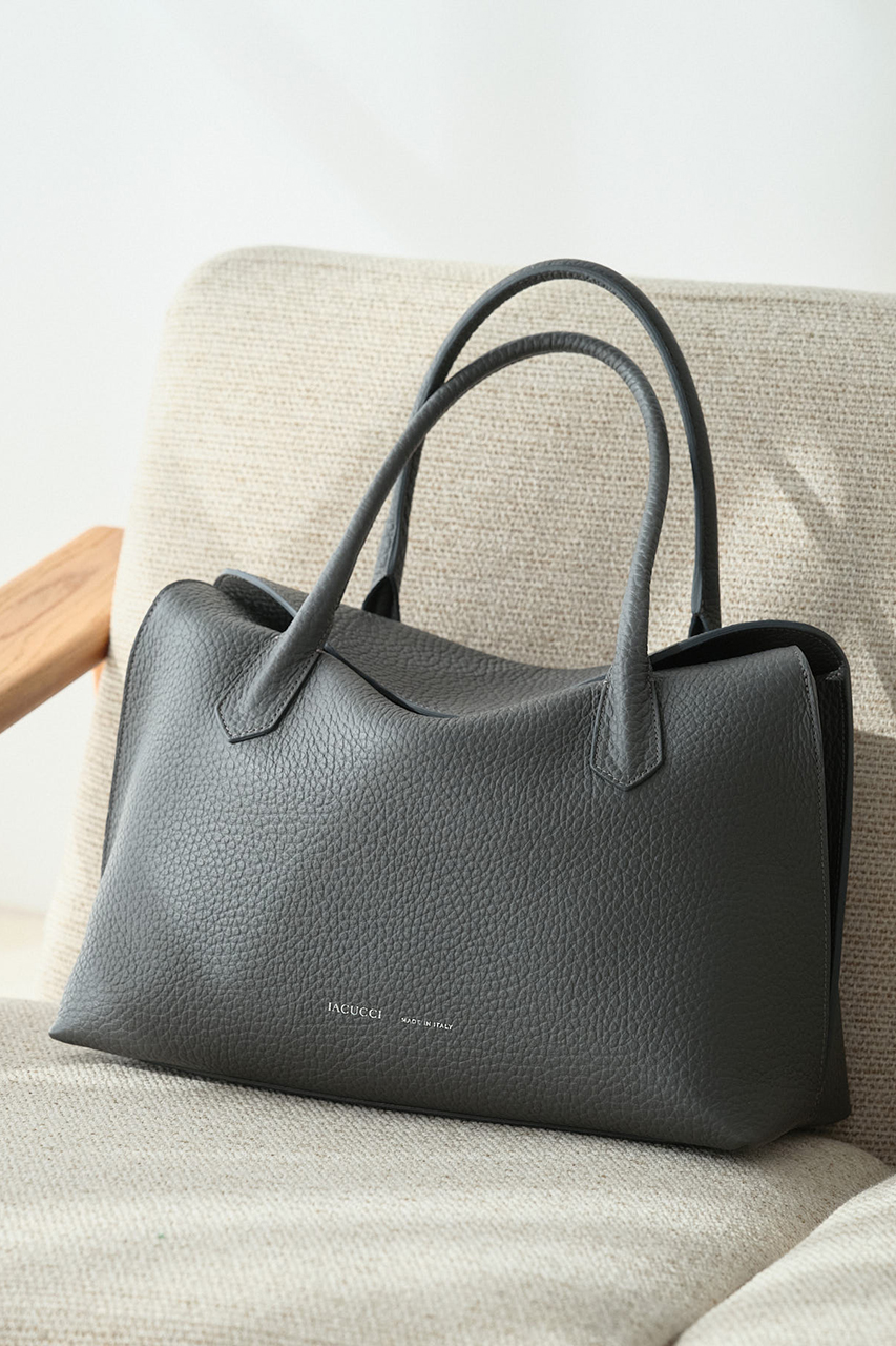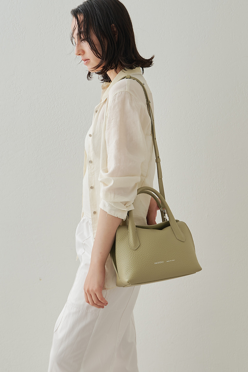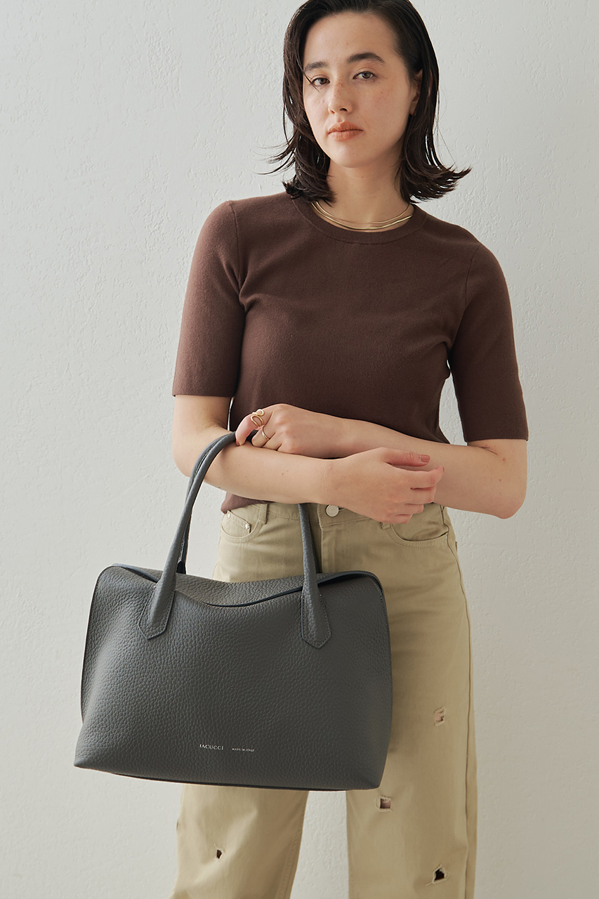 使用しているシボ感のあるレザーが、上品な風合いで柔らかい印象に導いてくれます。