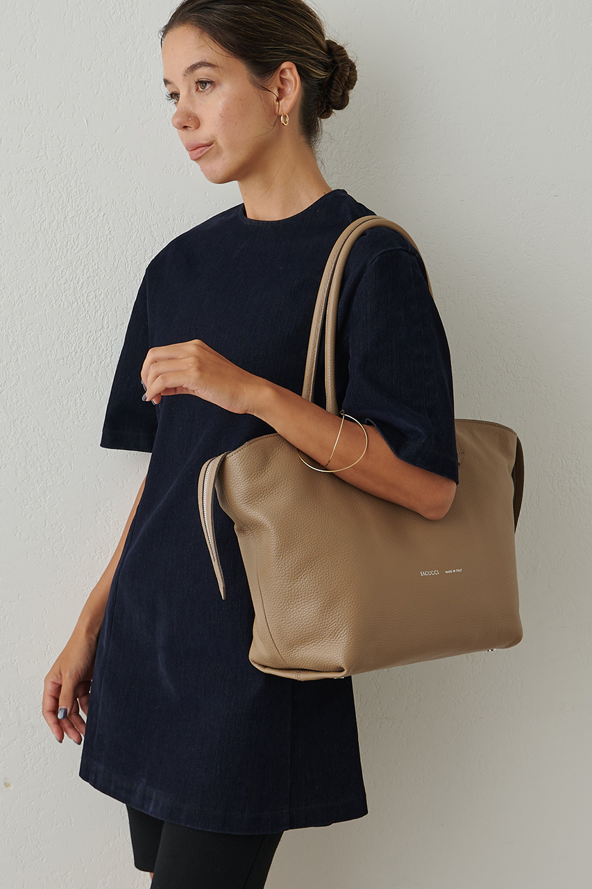 通勤からプライベートまで幅広く活躍するトートバッグ。荷物が少なめの日でも、あえて大きめサイズを選んでトレンド感を演出するのもおすすめ。コーディネートの主役として取り入れてみて。