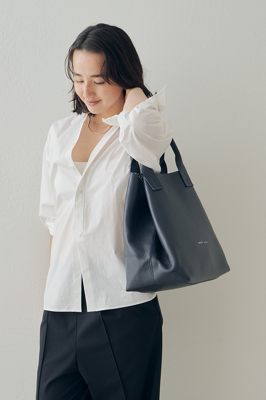 サイドの隠しマグネットを広げると横長トートにも変化させられることから、通勤バッグとしても人気が高く、オンオフ兼用で使いやすいデザインとご好評をいただくバッグです。