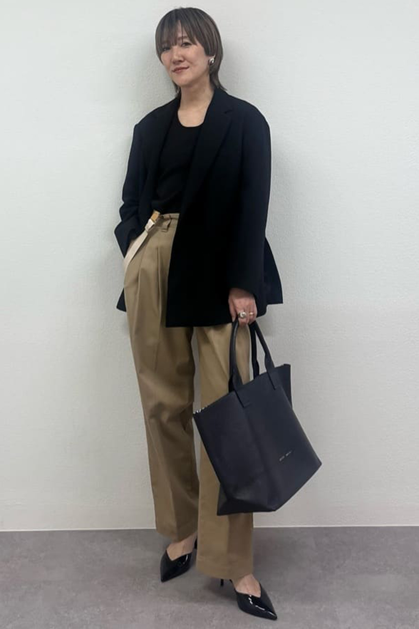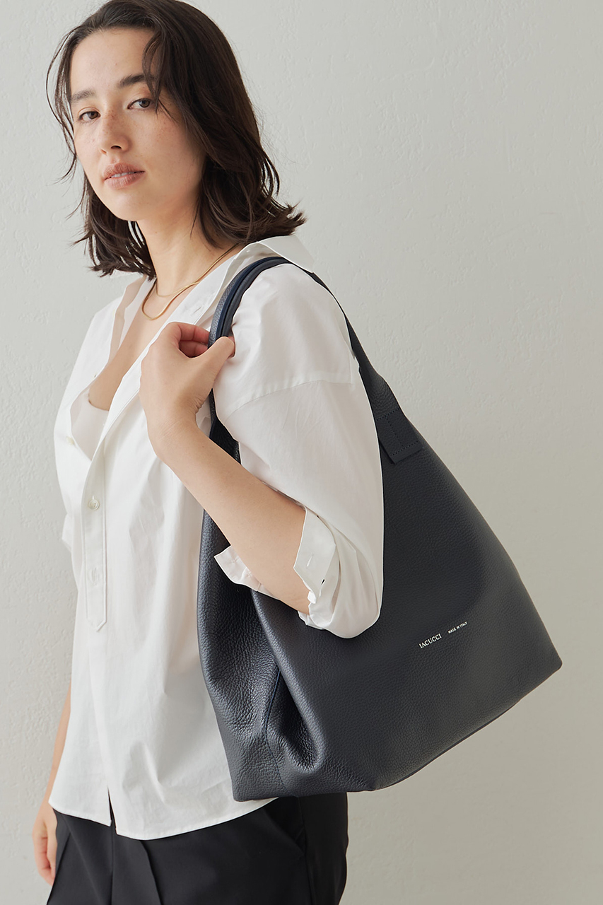 トレンドライクな大きめトート。ざっくりとした印象で、大人だからこその洗練された雰囲気を醸し出してくれます。肩掛け可能な長めのハンドルで、冬のアウター時期にもぴったり持ちやすいサイジング。