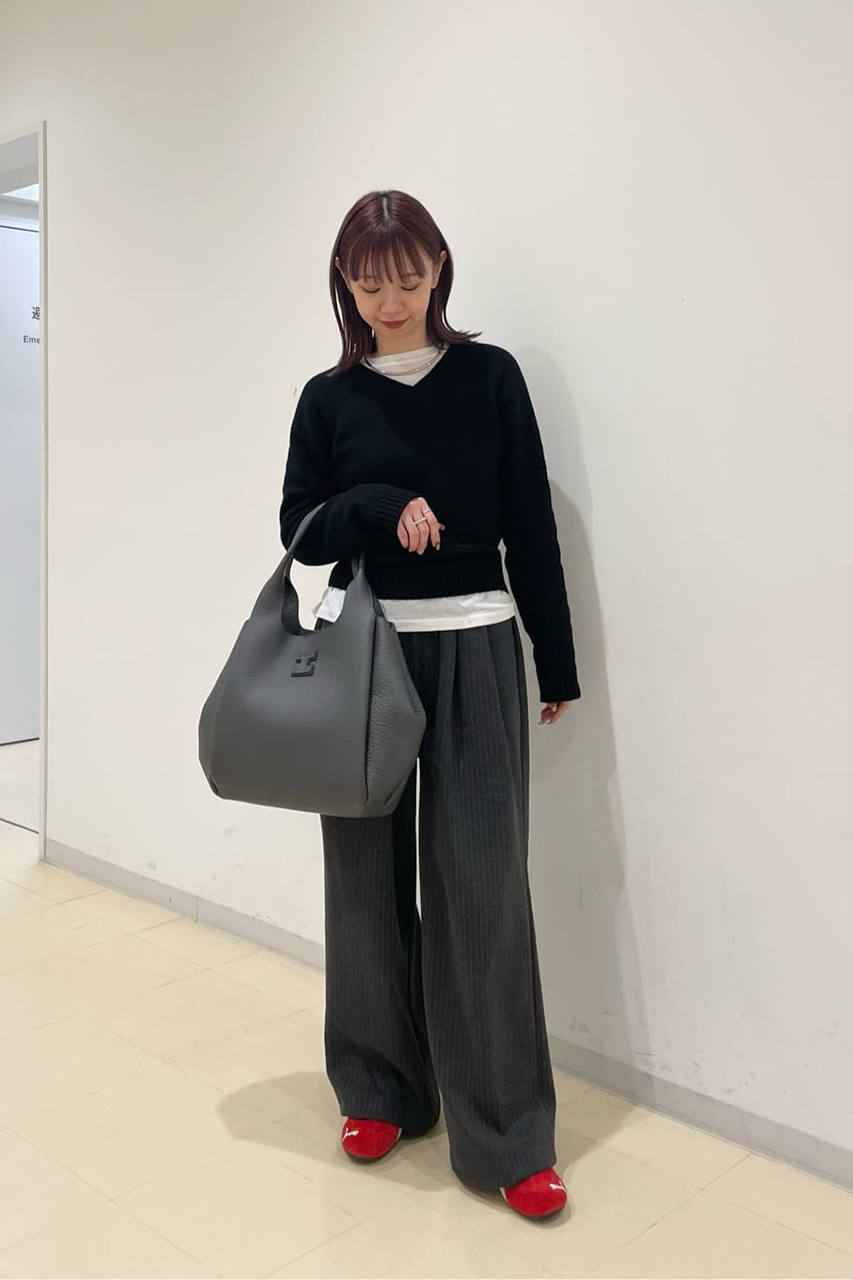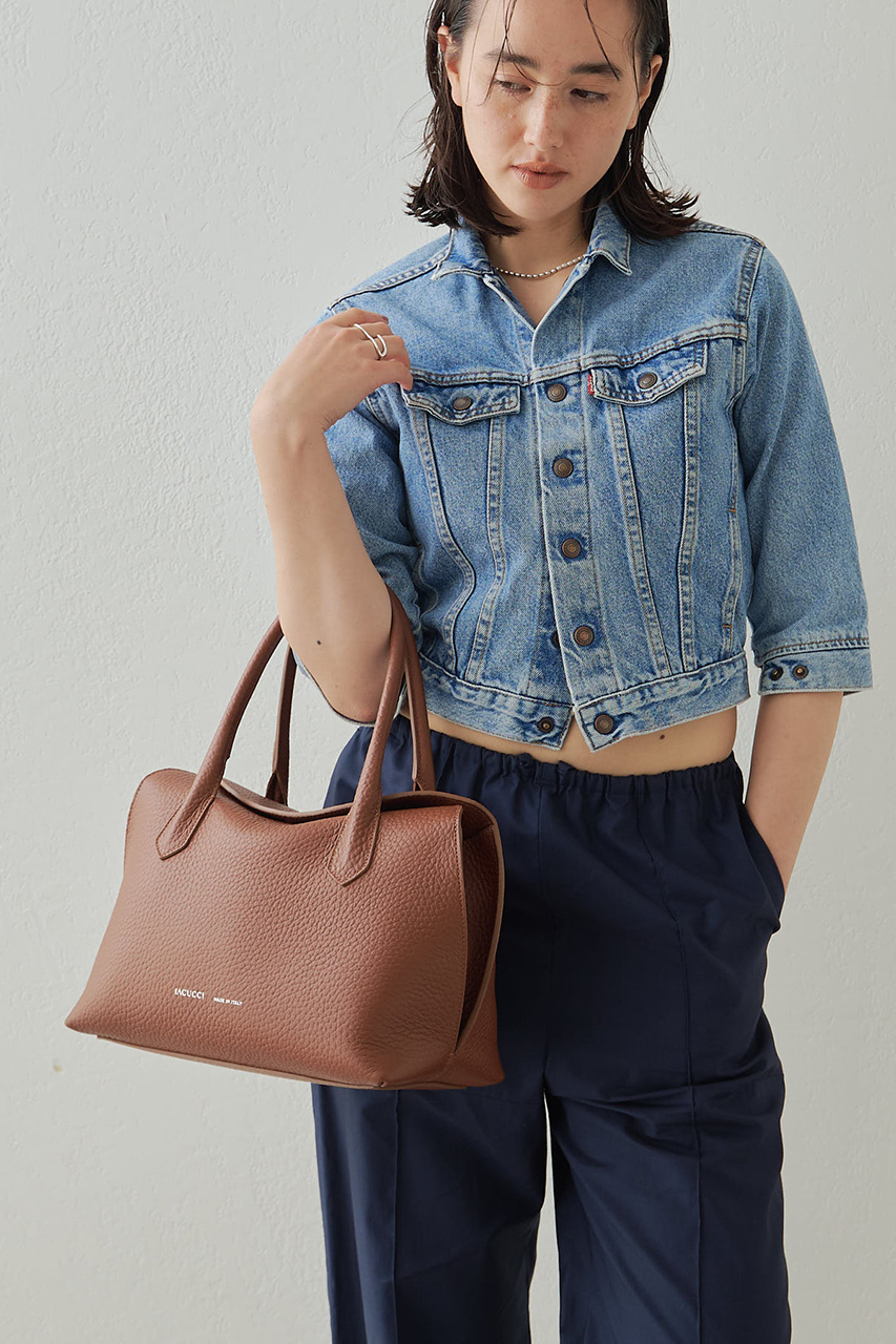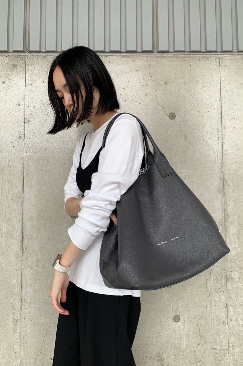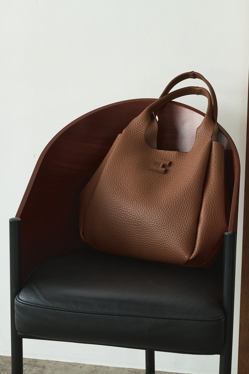 柔らかで上質なレザーと、上品なラウンドフォルムが目を惹くトートバッグ。通勤に使っているスタッフも多く見受けられます。肩掛けしやすく、容量も申し分なしのサイズ感がリアルに使いやすい理由なのかもしれない。