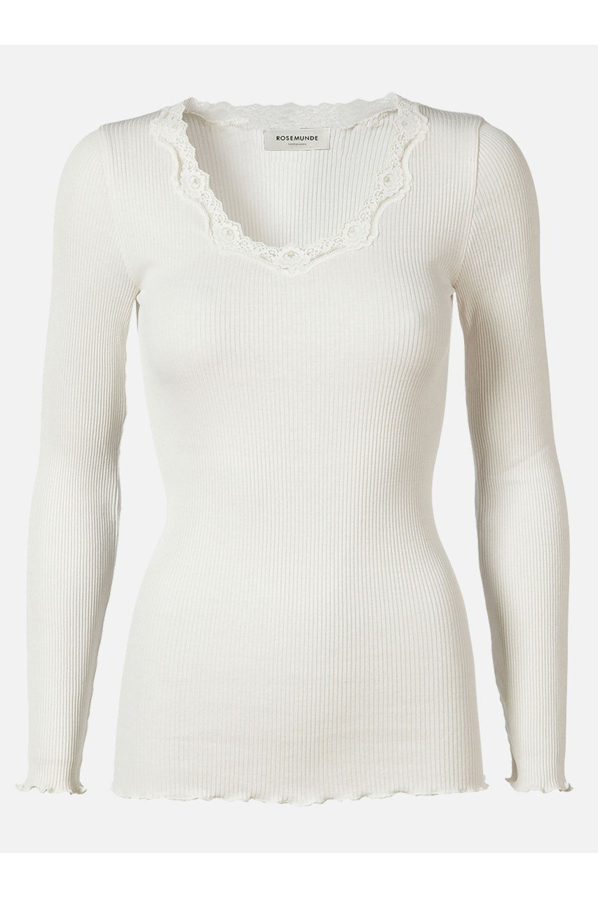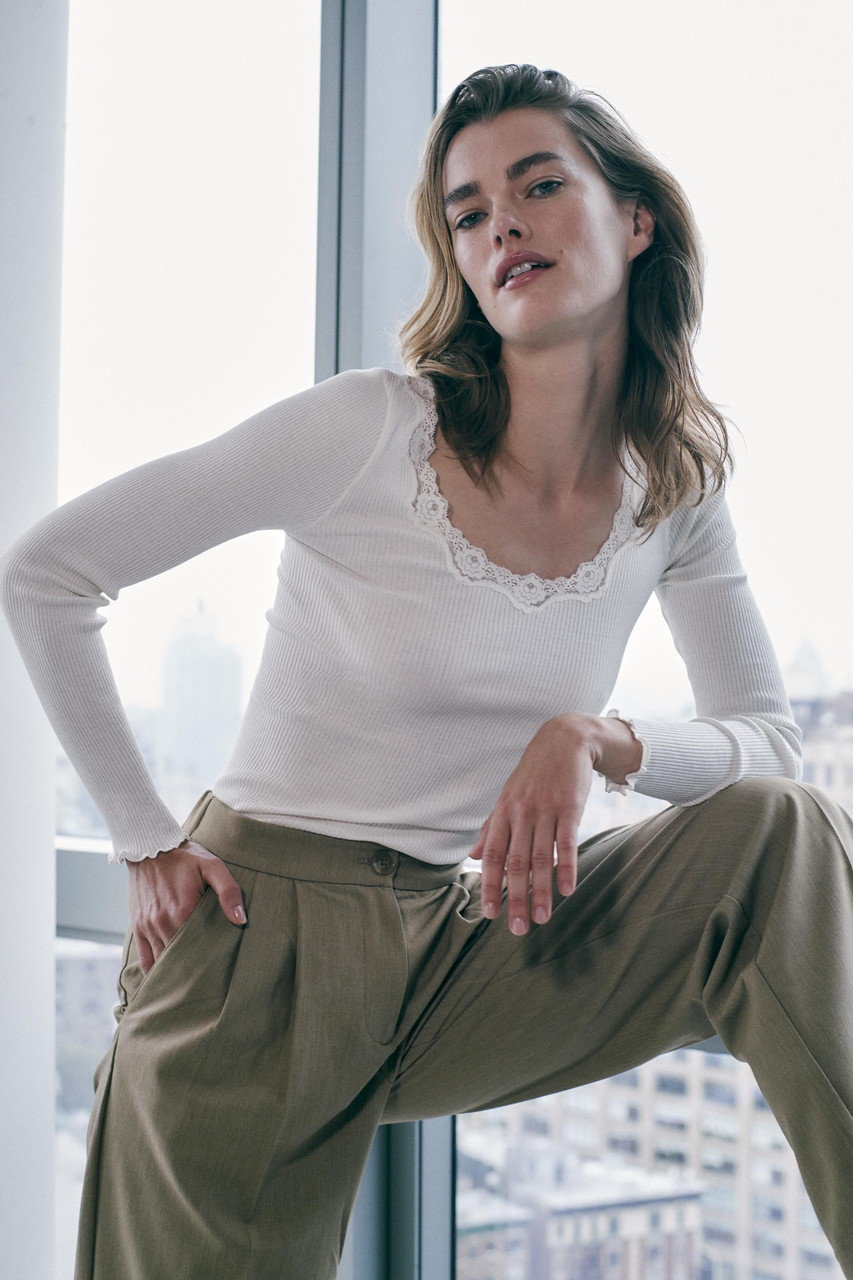 シルク×コットンの滑らかな肌触りで、冬は暖かく、夏は涼しく体温を調節して快適に過ごせる優秀なインナー。ホールガーメント仕様で身体のラインをきれいに見せてくれるのもうれしい。レイヤードした時にもさりげなく見える胸元のレースが女性らしさを引き立てます。
