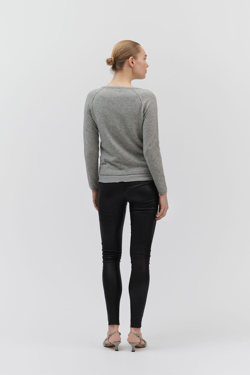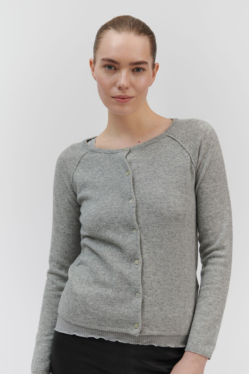 柔らかな肌あたりのシンプルなクルーネックカーディガンは一枚でも、今までご紹介したインナーとのレイヤードも楽しめる逸品。フロントにはマザーオブパールのボタンをあしらい、首を長く見せてくれるネックライン、合わせやすい着丈など細部にまでこだわりました。