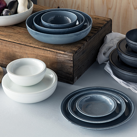 プレートやボウルはサイズのバリエーションが多くスタッキングが可能。渋みある釉薬の風合いとフォルムが素敵です。ボウルの上にプレートを被せると蓋のように綺麗に収まるのが◎。おもてなしの時に蓋を外せば、場が華やぐプレゼンテーションになりそうです。アイデア次第で汎用性も高いところも魅力的!