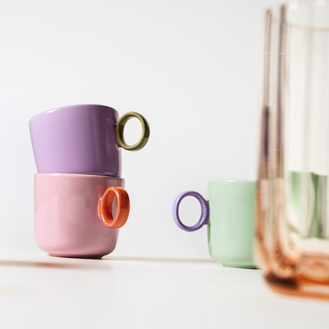 手描きでアクセントカラーが施されたマグのハンドル部分が特徴的。少し大きめのサイズで、カフェラテやホットチョコレート、たっぷりの紅茶を飲むのにおすすめ。デザイナーのアレクシ・クオッカが手がけた、どこかノスタルジックでありながらも新鮮なバイカラーのデザイン!