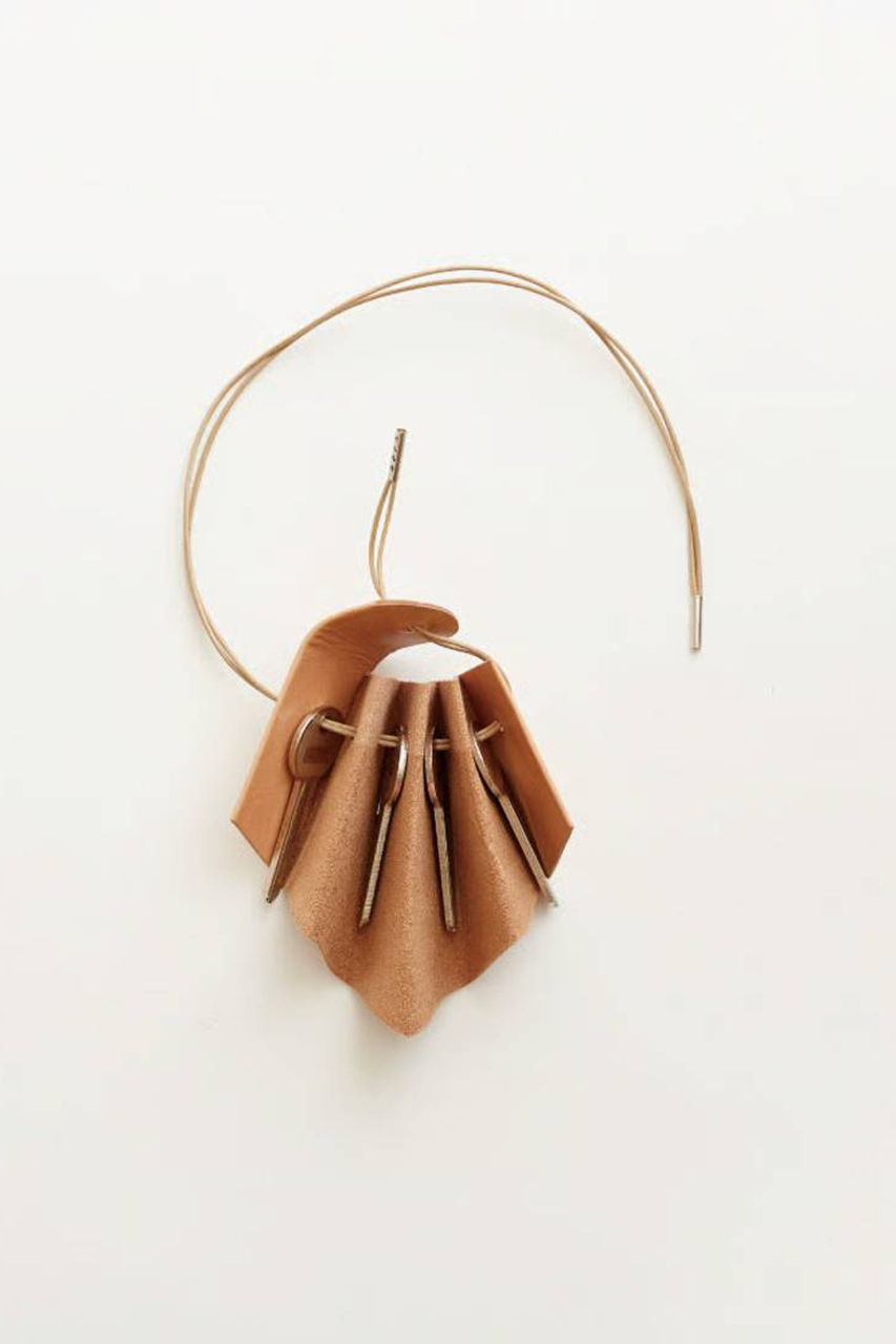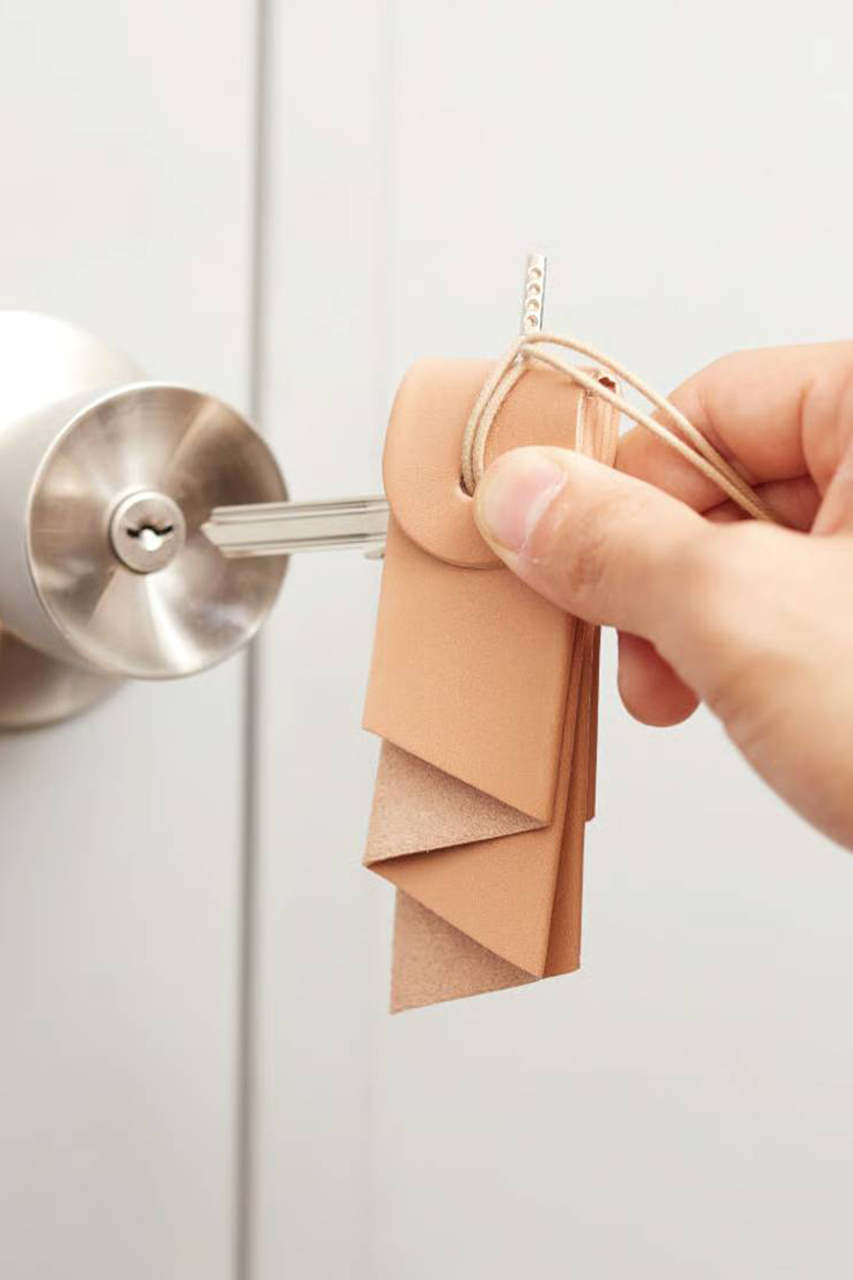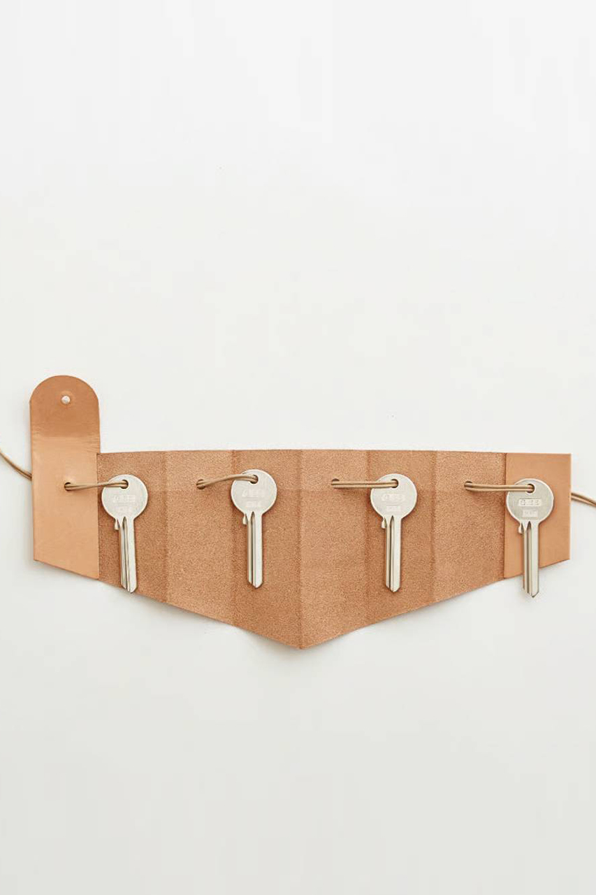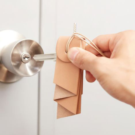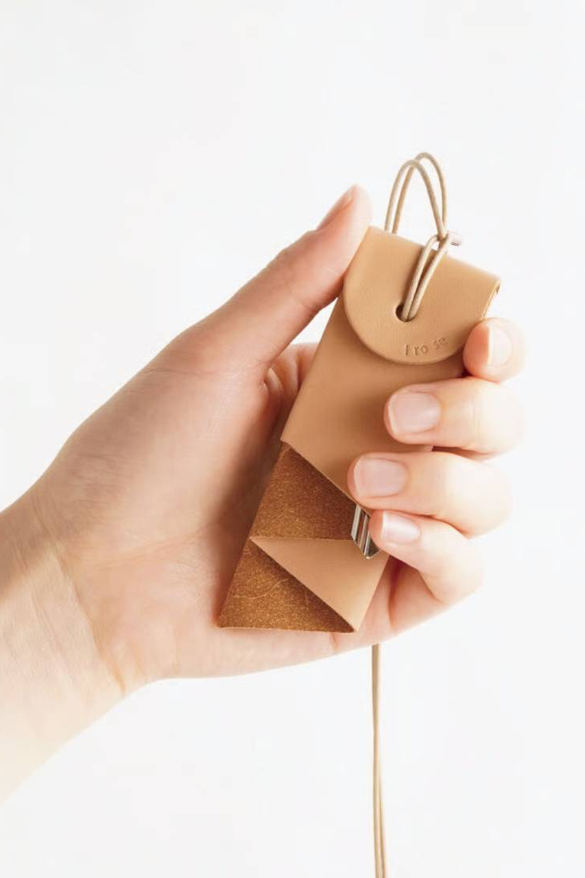 折り込まれた革の間にカギをはさみ、付属のストラップを通します。革の間からカギをスライドさせ使用します。折り目ごとにカギを分けることができ、取り出しやすく整理して収納ができます。カギを重ねて収納するタイプはかさばらずコンパクトで、革に包まれているデザインはカギが傷がつくことも軽減できます。長めのストラップは首からさげたり、バッグにつけたりと様々な使い方が楽しめます。長さに余裕があるのでバッグにつけた状態でカギを開けることができます。