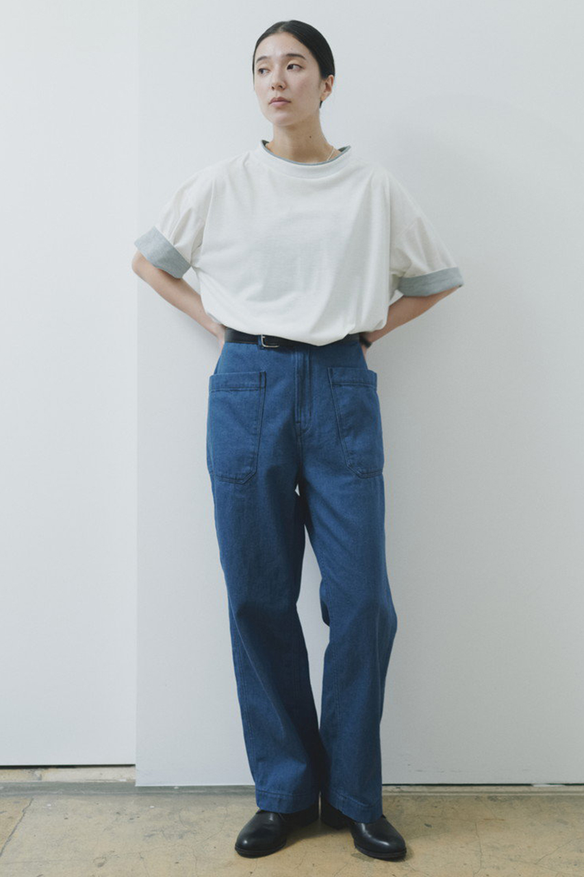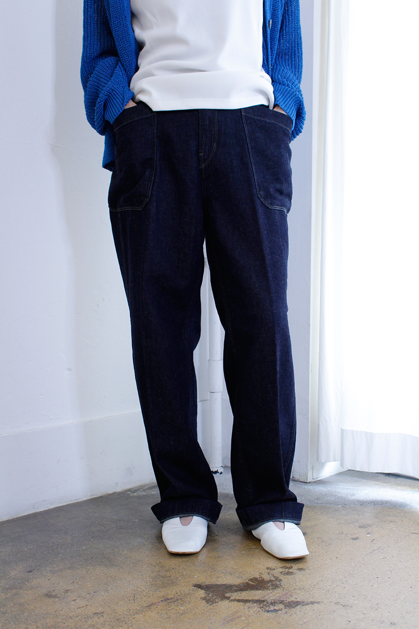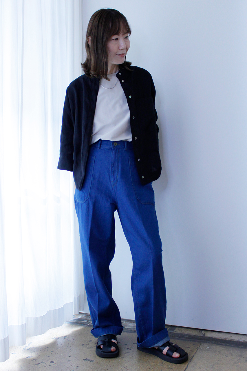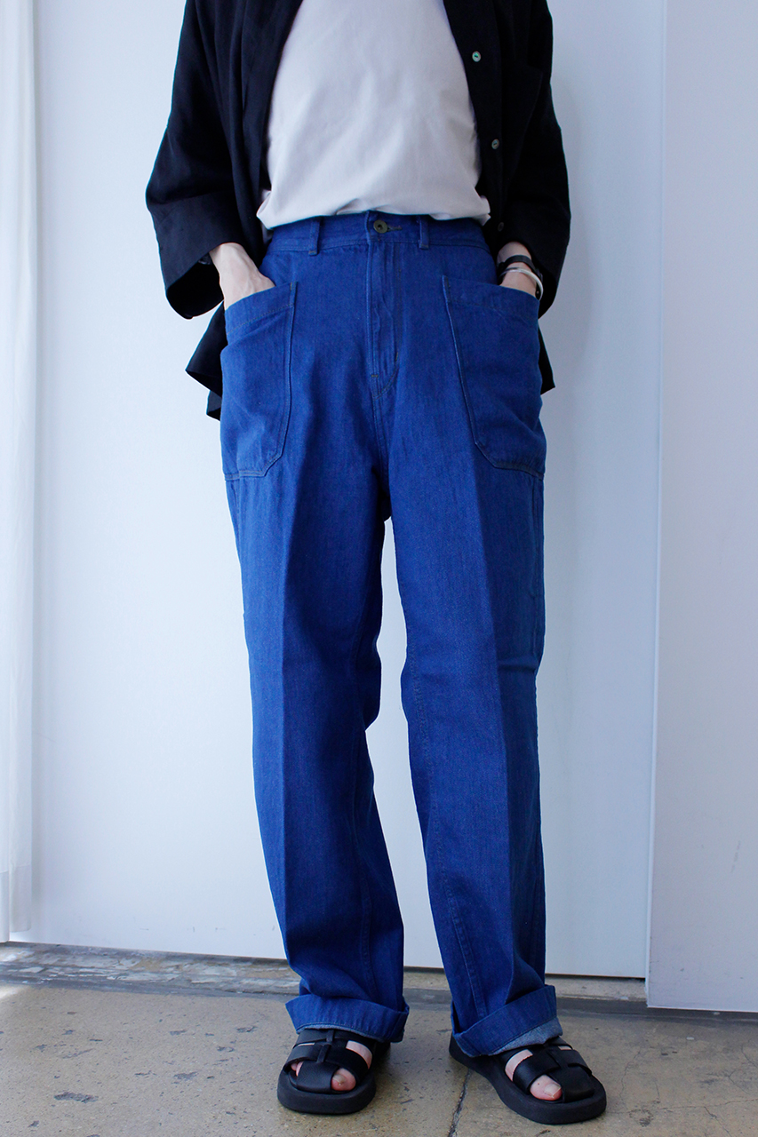 生地選びにこだわりを感じる「レリル」のアイテム。今回のランチパンツは、“夏でも涼やかにはける”ために、綿100%ではなく麻を入ることで通気性に優れ、ドライ感がある綿麻インディゴデニムを使用しています。