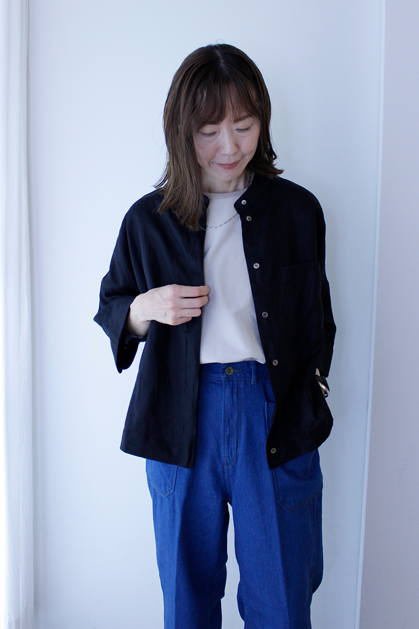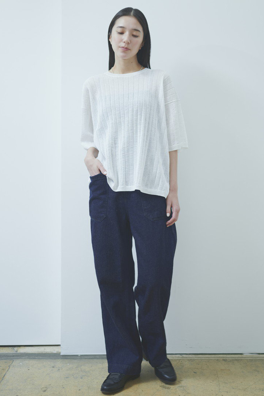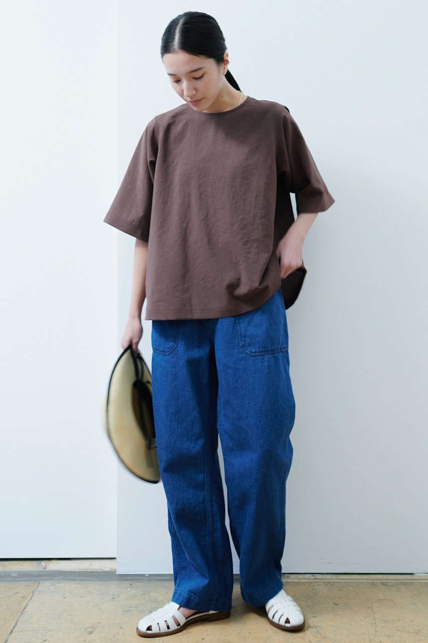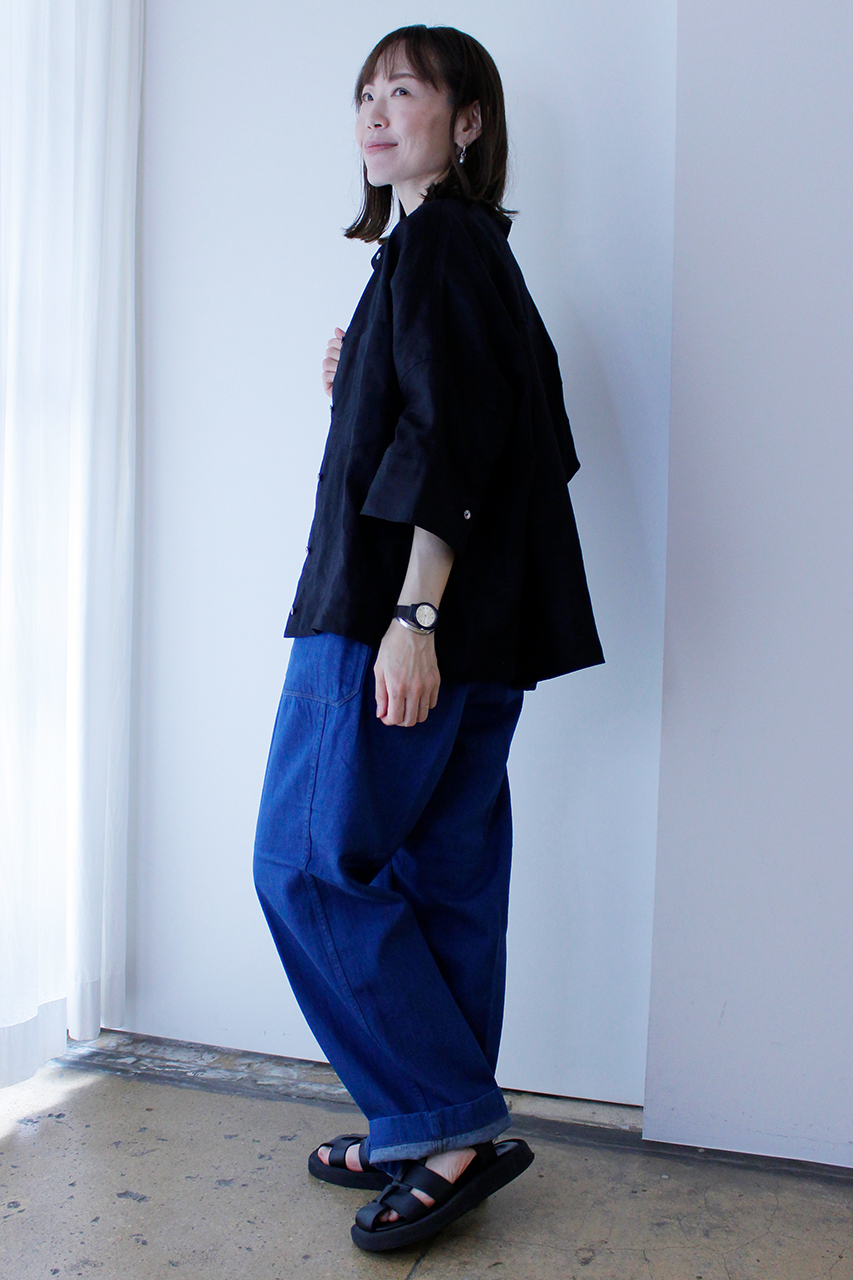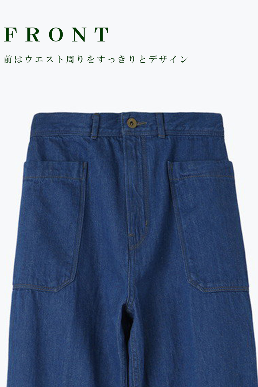 生地選びにこだわりを感じる「レリル」のアイテム。今回のランチパンツは、“夏でも涼やかにはける”ために、綿100%ではなく麻を入ることで通気性に優れ、ドライ感がある綿麻インディゴデニムを使用しています。