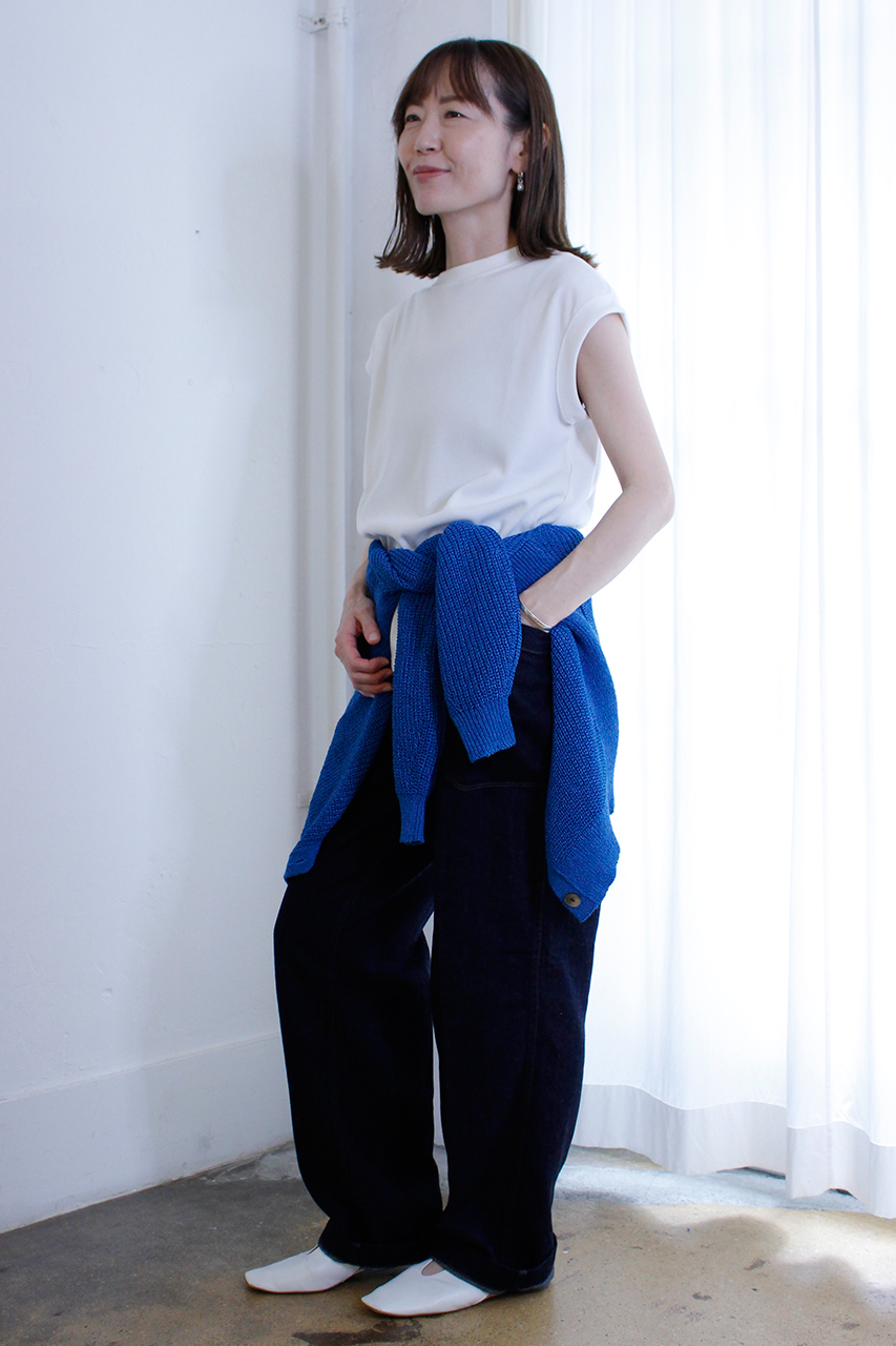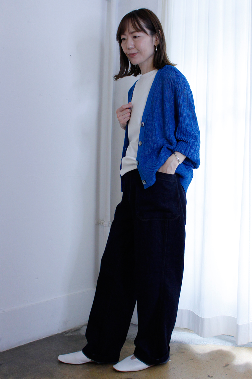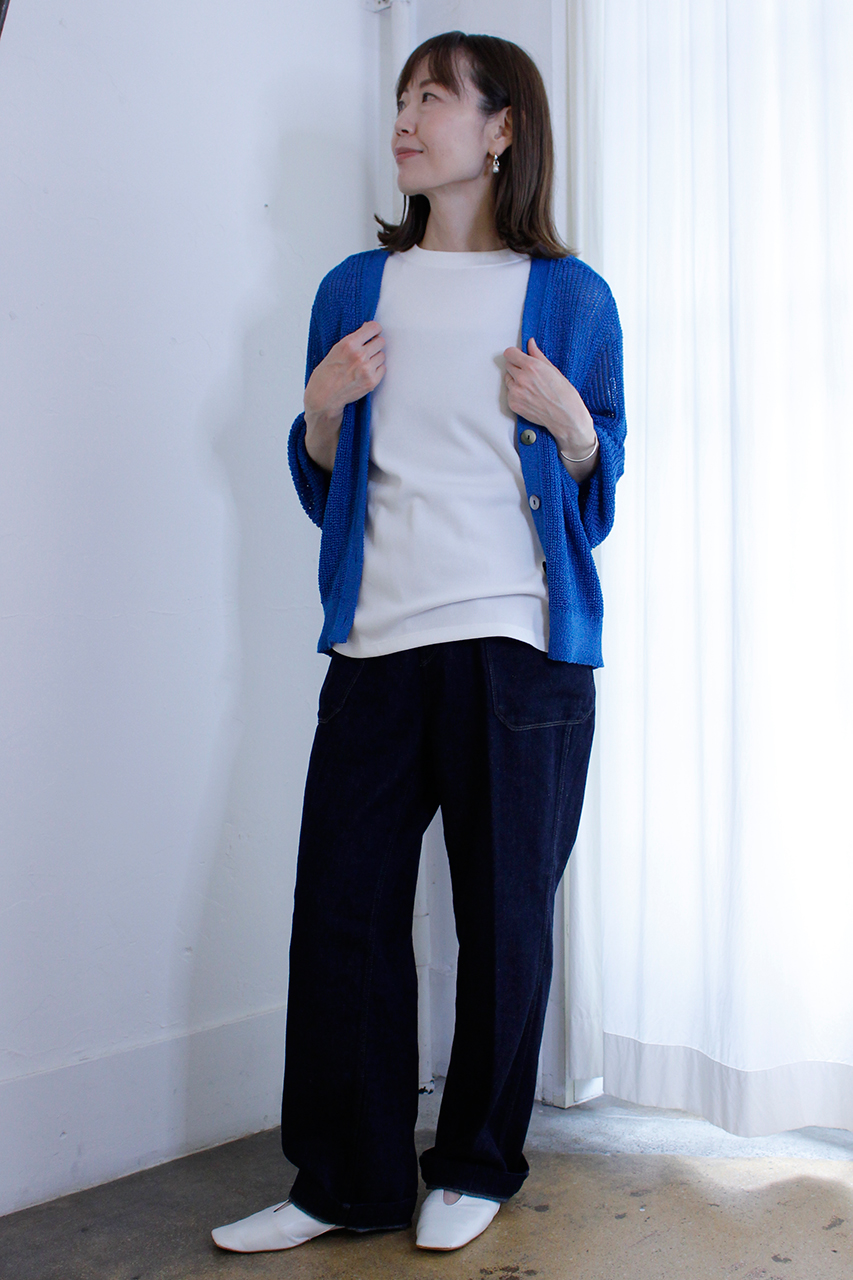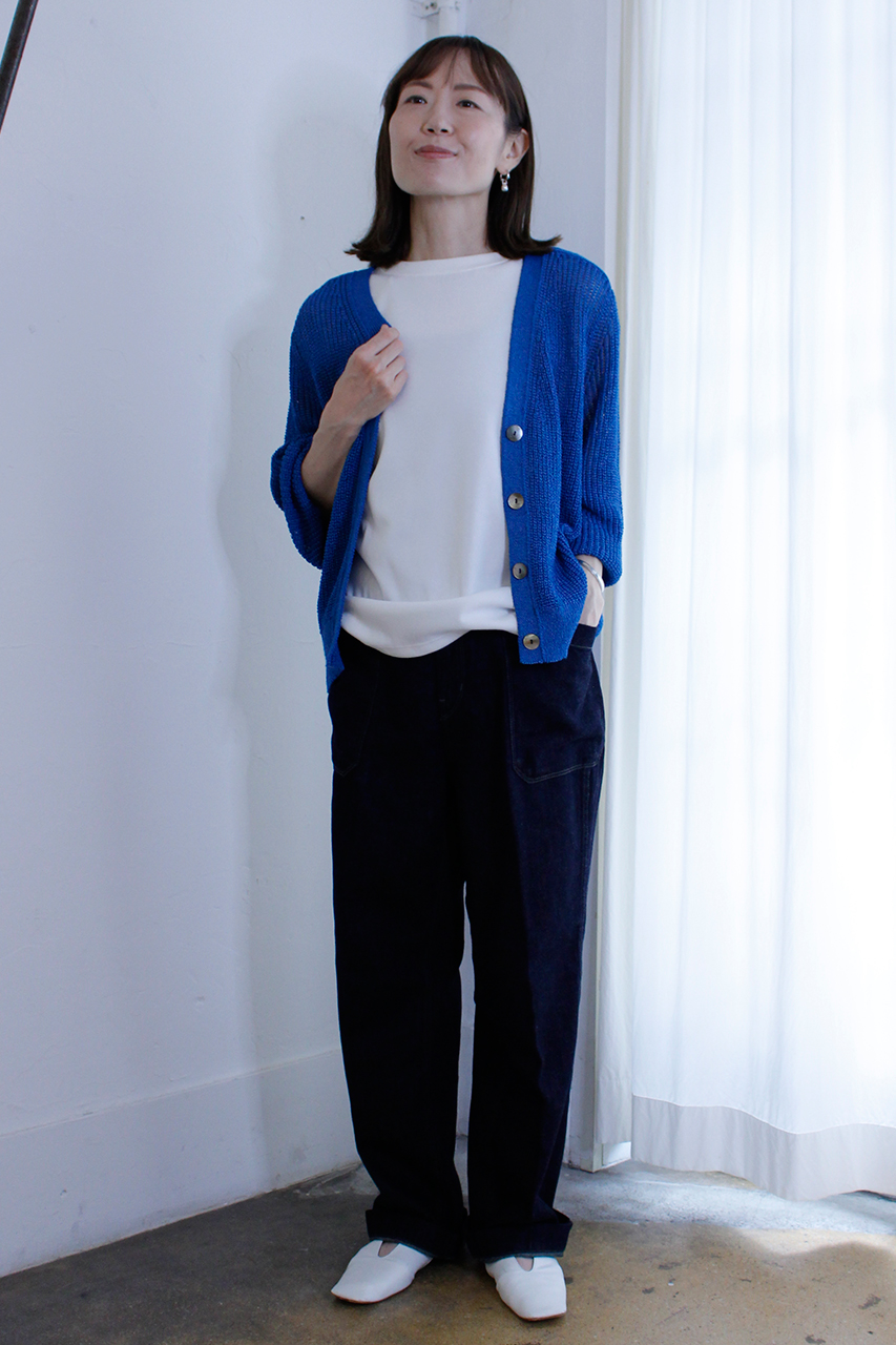 インディゴのランチパンツには、ホワイトのフレンチTに差し色でブルーのカーディガンをチョイス。