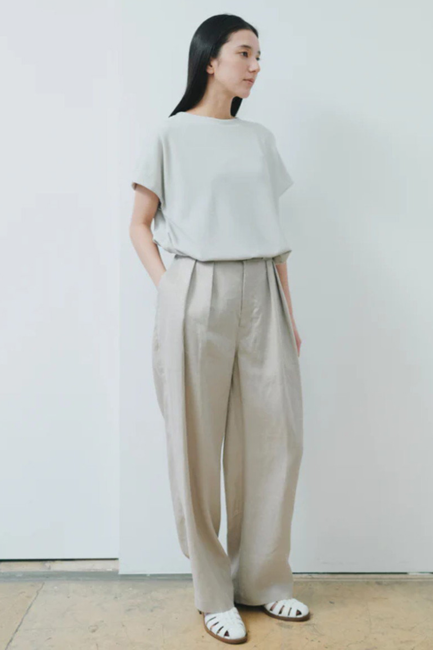吸水速乾、接触冷感、防シワのハイテク機能満載の涼やかなブラウスに秋色をのせて。スモーキーな色味が、秋のムードを高め今の気分に寄り添います。まだまだ暑さが残る晩夏にぴったりなブラウスです。