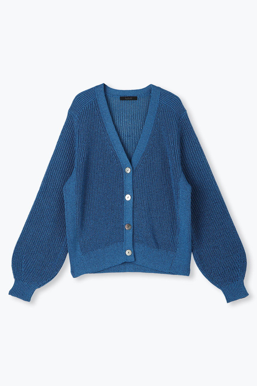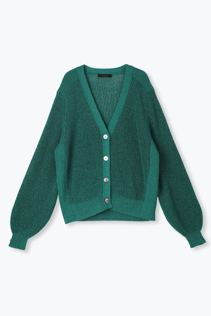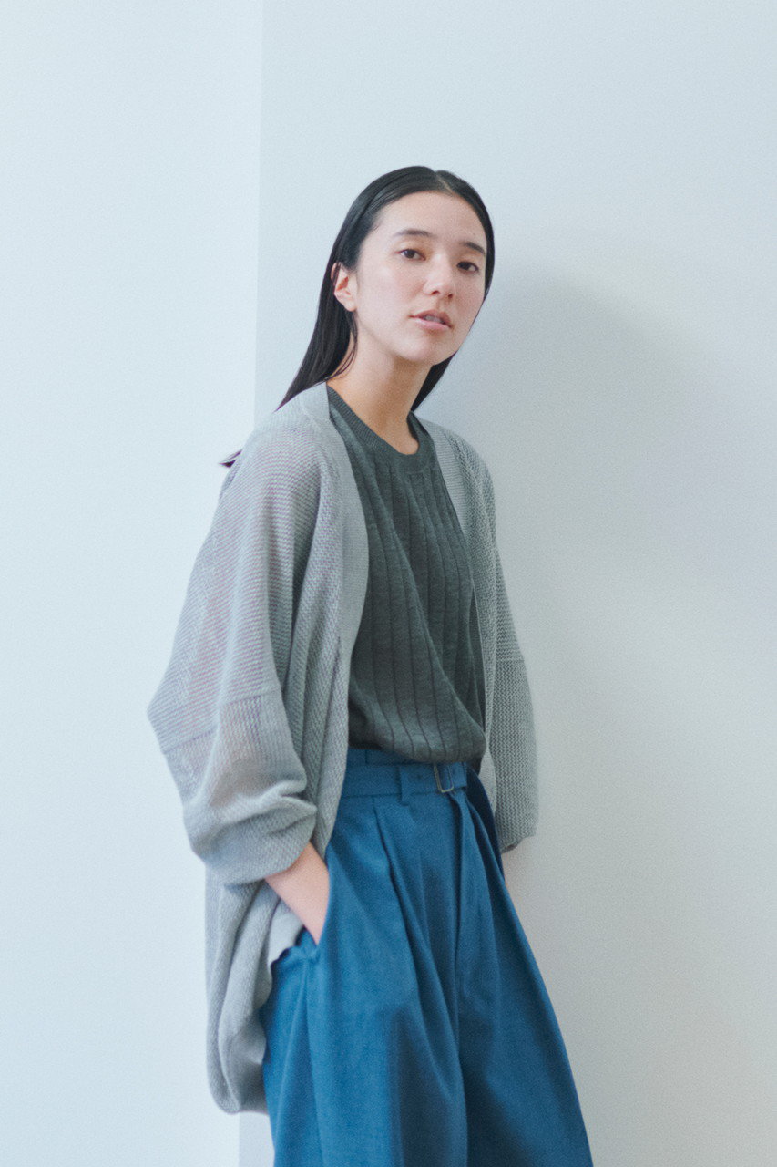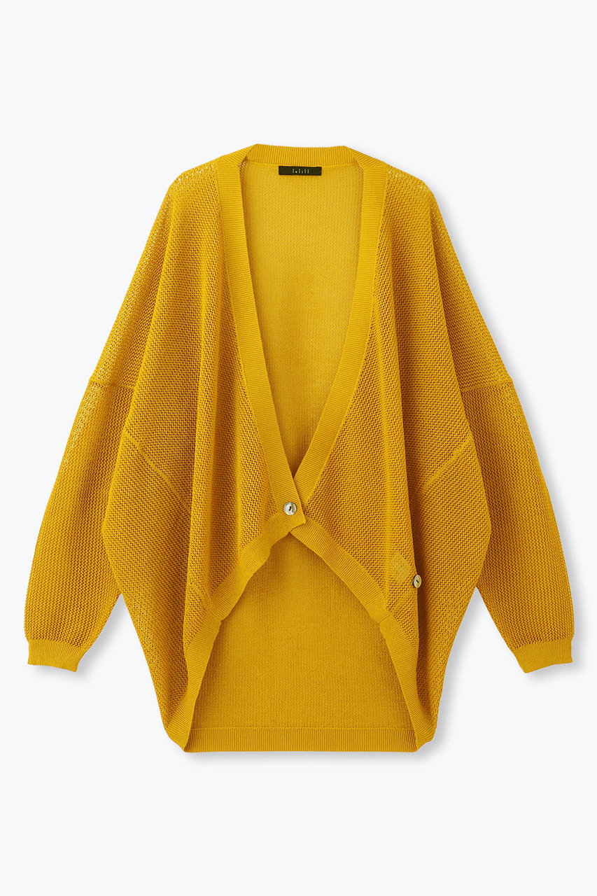 ドライなタッチが持続するポリエステル擬麻(ギマ)糸のボレロとカーディガン。風通しが良く涼やかで、まだまだ暑い今からでも羽織りスタイルを楽しめます。