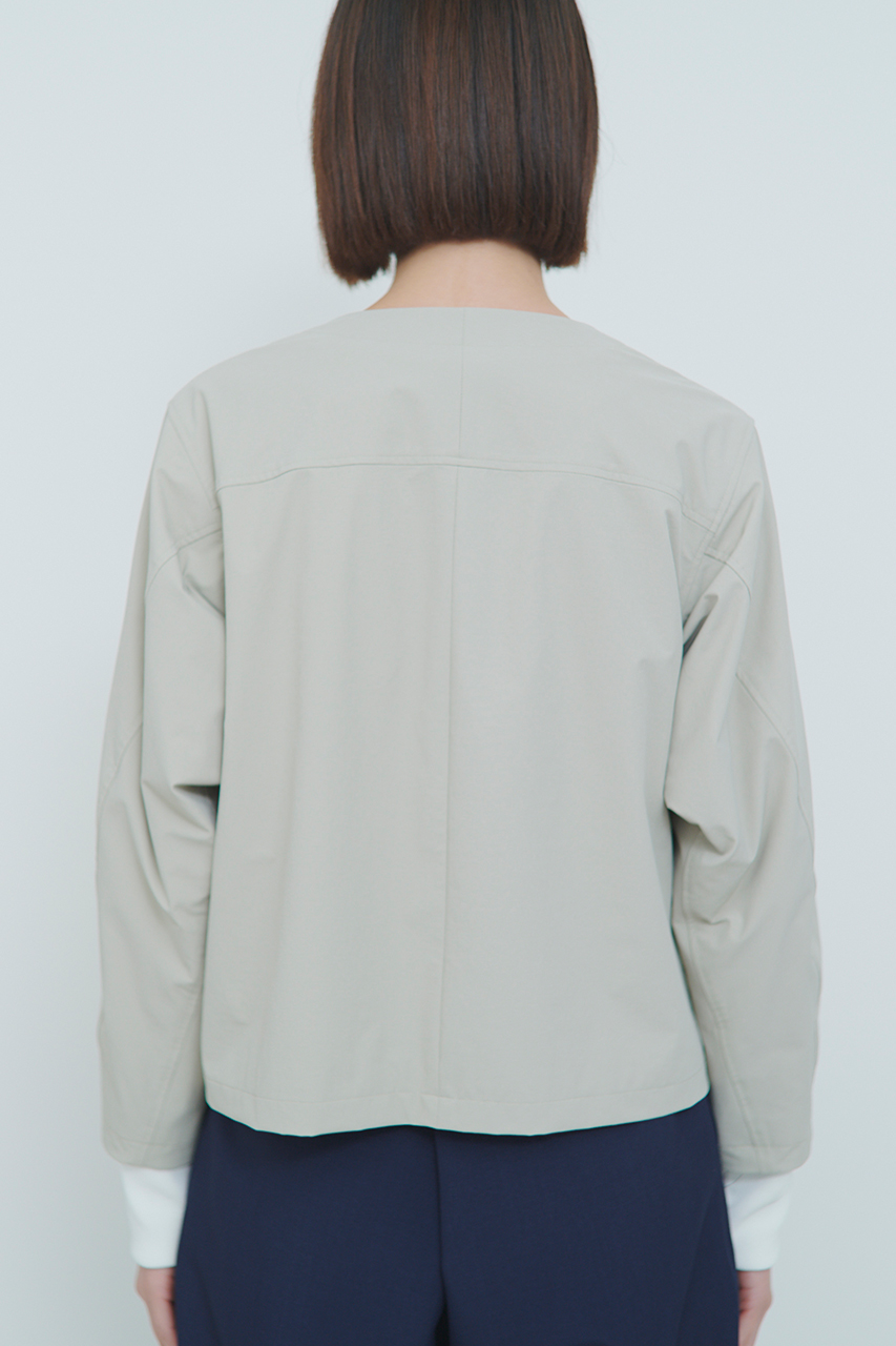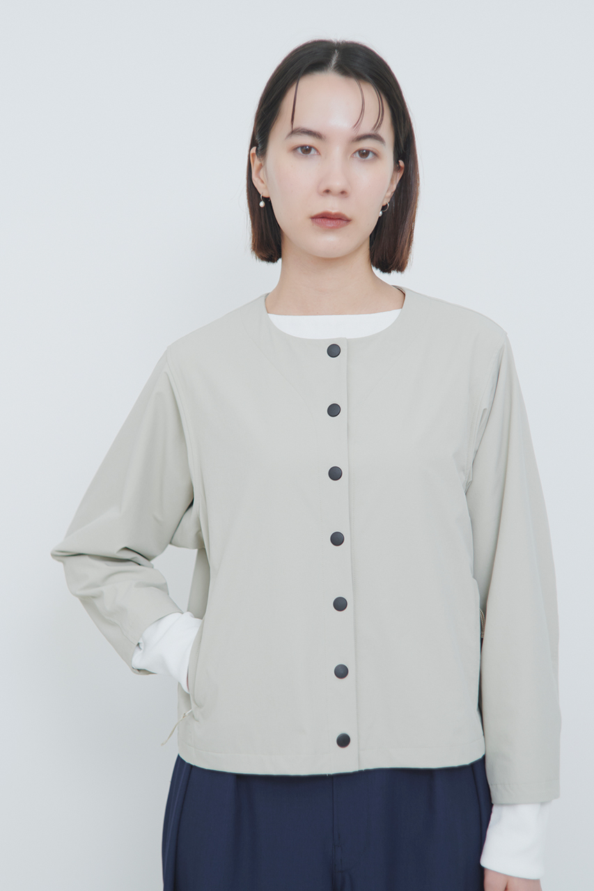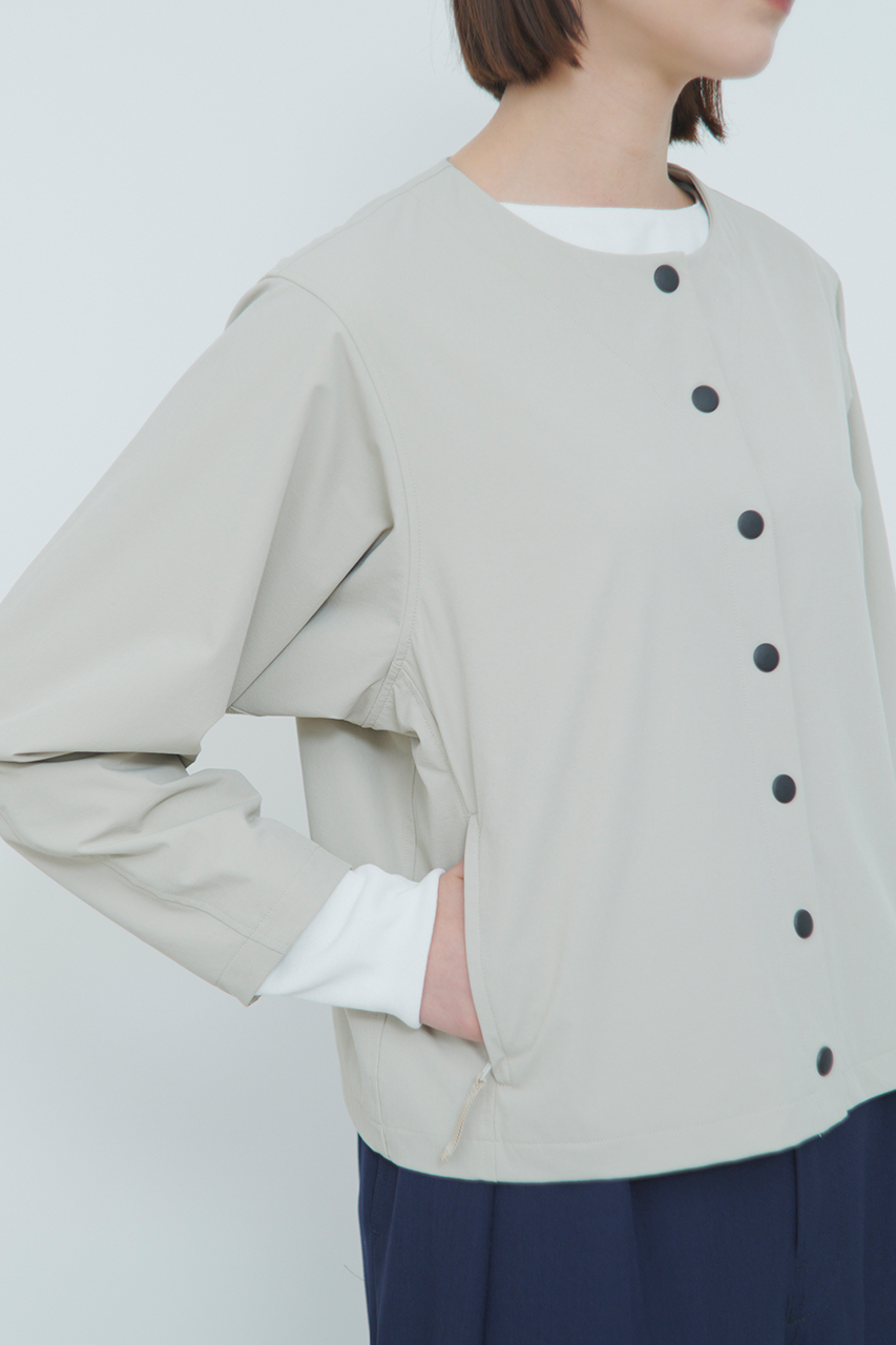 ジャケットはシンプルなフロントボタンのノーカラージャケット。立体的な袖のシルエットと背中の分量をたっぷりと取っているので、レイヤードしても窮屈さを感じません。シルエット美を追及しながら、ソフトシェル素材を最大限に生かした1枚です。コンパクトに畳みやすく通勤着としてもおすすめ。