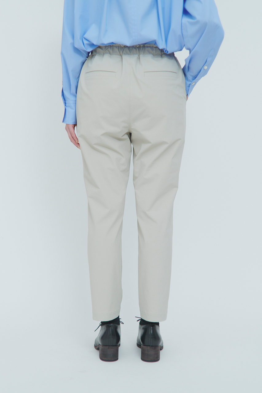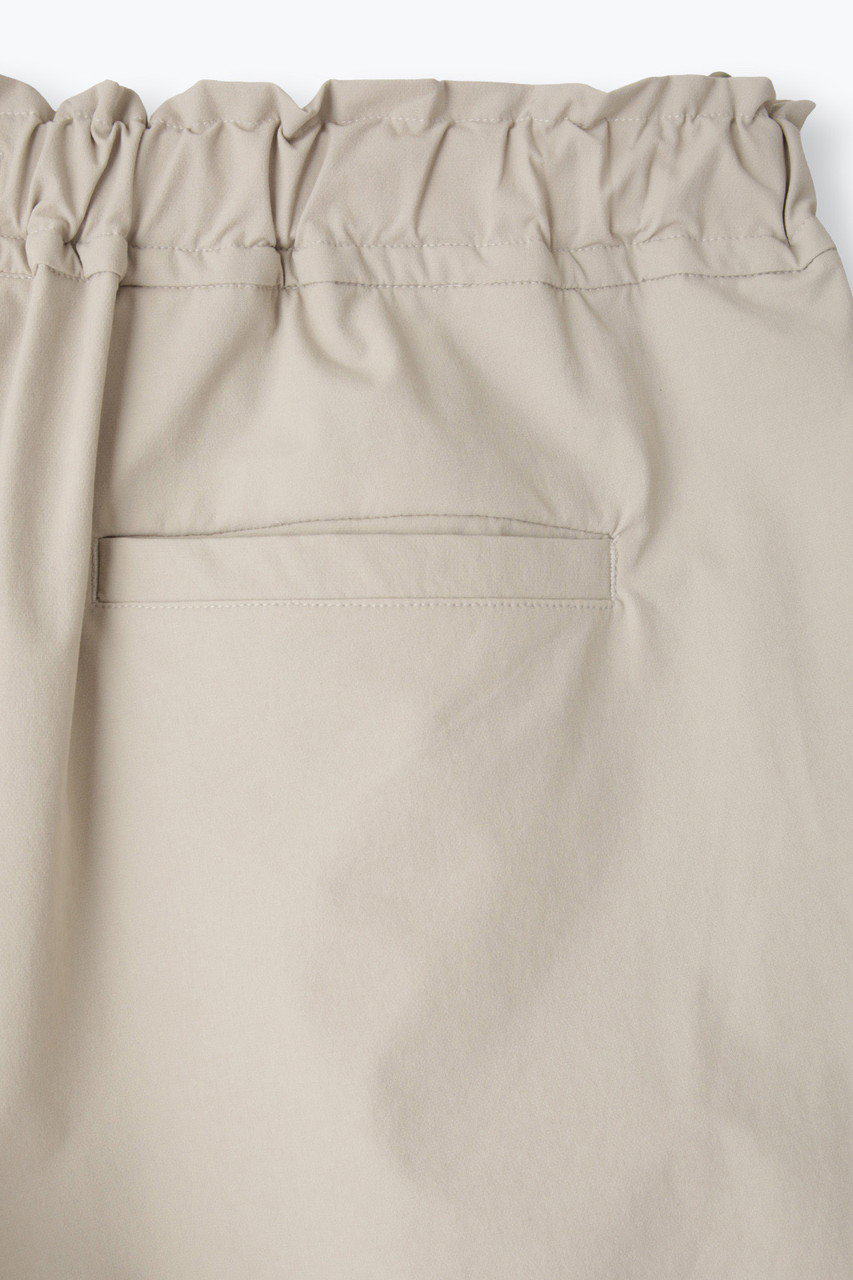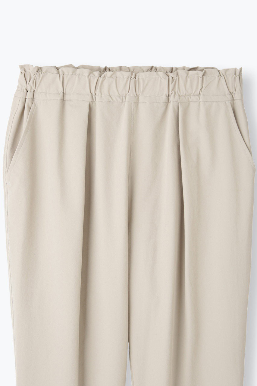 次はパンツをご紹介。シルエット美が魅力の人気のタックテーパードシルエットに、ソフトシェル素材を用いてアップデートしました。フロントタックを入れることですっきりとした見ためながらも、腰から太ももまでに生まれるゆとりがリラクシーなはき心地を感じさせてくれます。ウエストの内側にはドローコードを入れて、サイズ調整も可能。スウェットパンツの様な感覚で綺麗めパンツをお楽しみください
