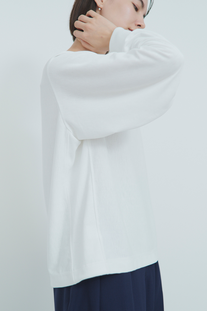 そして長く綺麗な状態を保つための細工も。身頃は型崩れを防止するためにヨコ地の目になっています。またサイドにはリブを入れることで、身体の線を拾いにくくキレイなシルエットに。1枚でニュアンスが出る大人のロンTです。