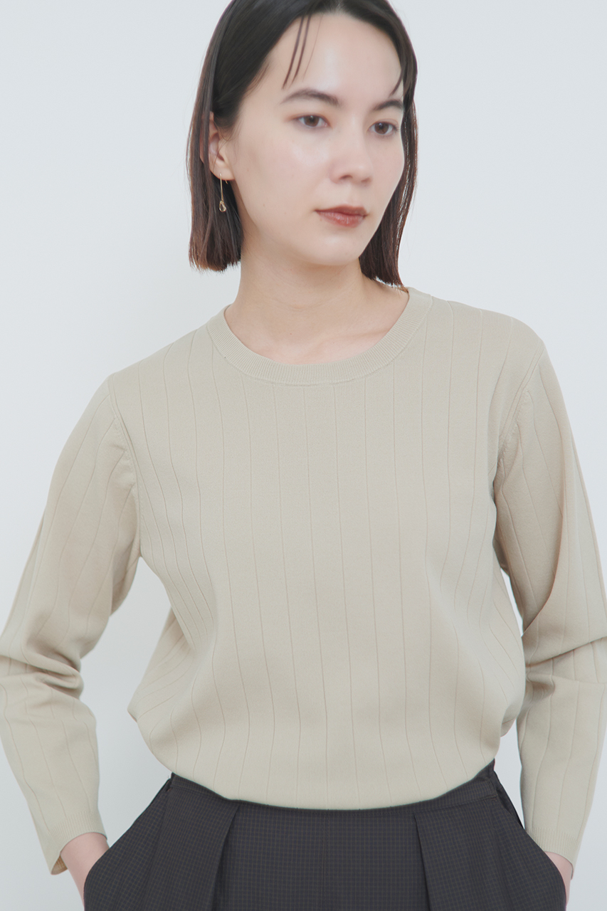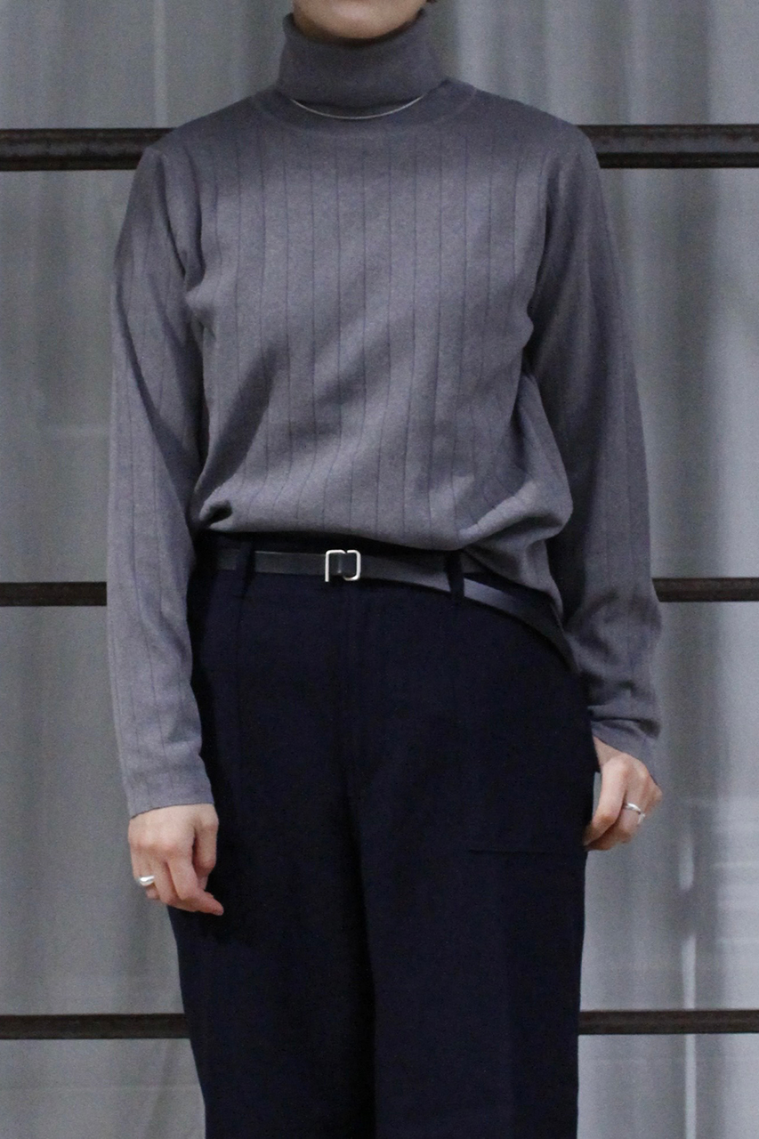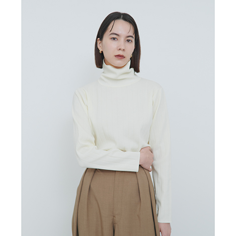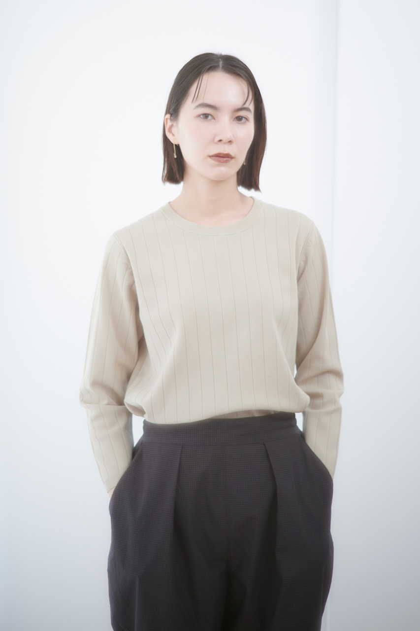 毎シーズン大人気のハイテクニットカットソー。こちらも今回は編み地をワイドリブにすることによって、定評のある着心地の良さに加えて、更に身体の線を目立たなくなる生地感に仕上がっています。シンプルにどんなボトムスとも好相性で、とにかく着回し力の高い薄手ニットです。裾には少しスリットを入れて程よくこなれた印象も出せる優秀さもポイント。