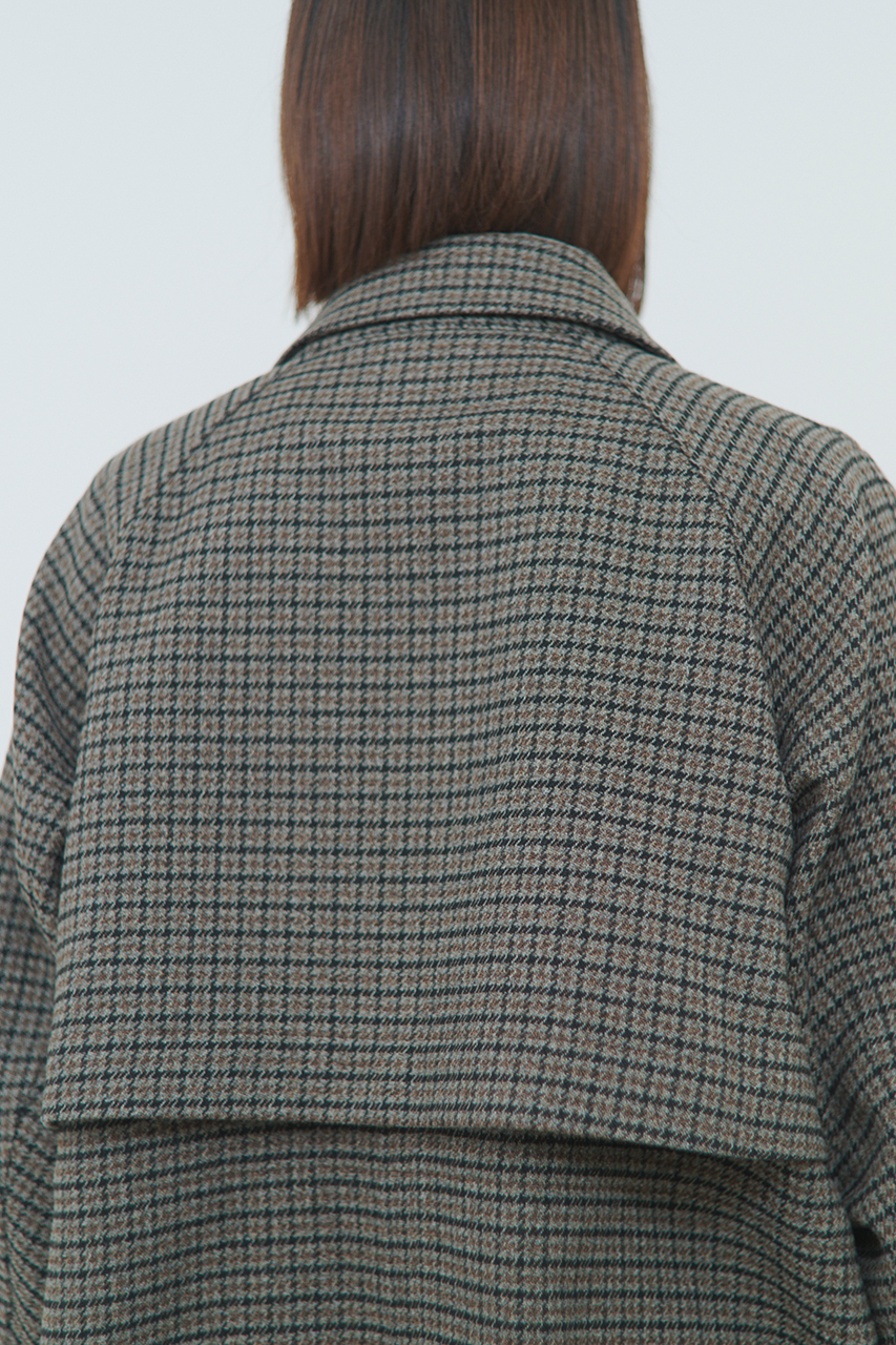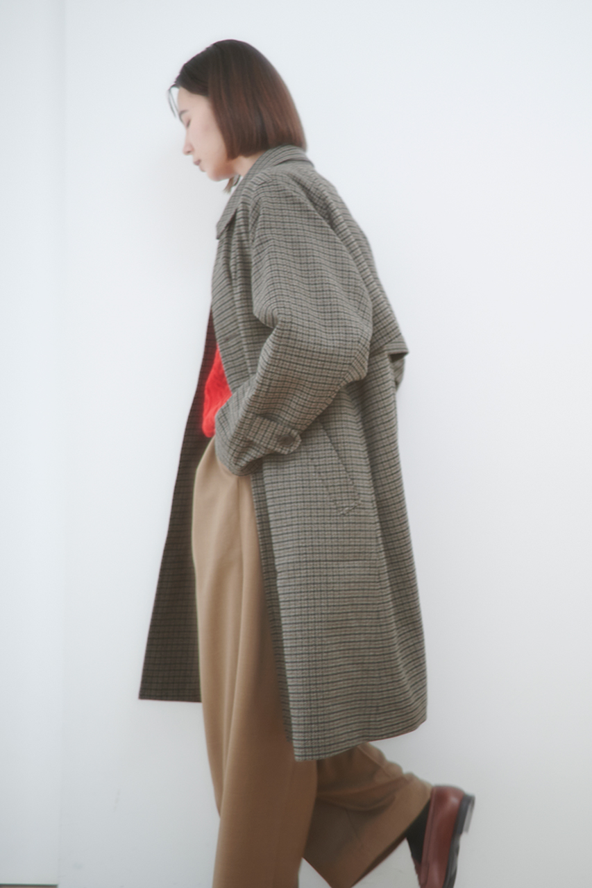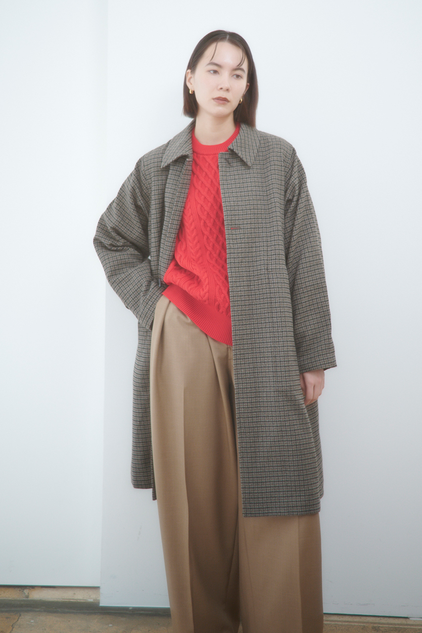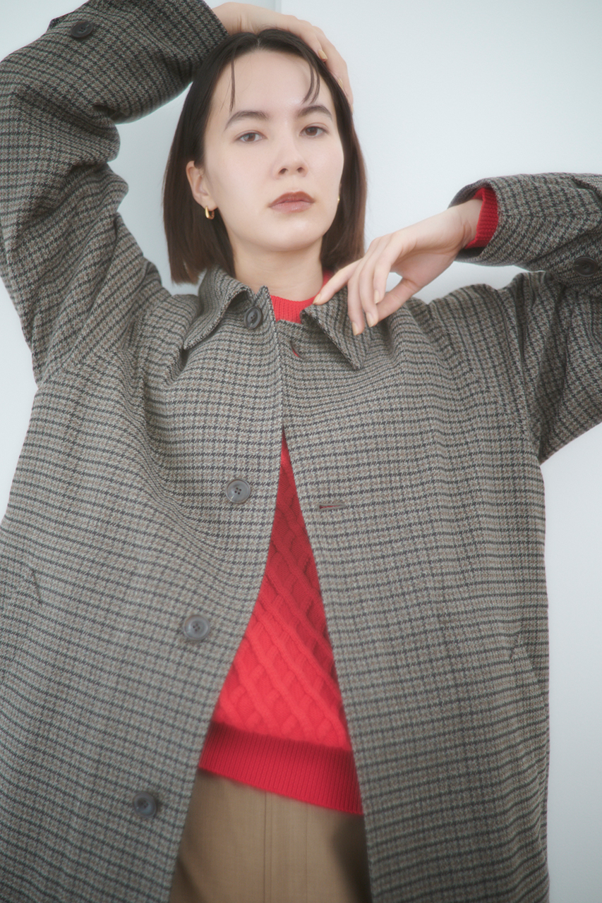 実際はポリエステル素材ながらも、ウールツイード見えするバルマカーン(ミドル)コート。シワにも強く、何より洗濯可能な高い機能性を持ったテックツイードを使用しています。